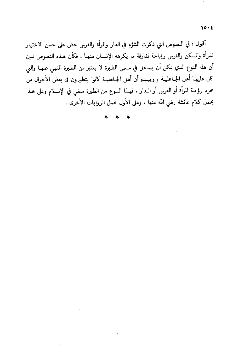 أقول: في النصوص التي ذكرت الشؤم في الدار والمرأة والفرس حض على حسن الاختيار للمرأة والمسكن والفرس وإباحة لمفارقة ما يكرهه الإنسان منها، فكأن هذه النصوص تبين أن هذا النوع الذي يمكن أن يدخل في مسمى الطيرة لا يعتبر من الطيرة المنهى عنها والتي كان عليها الجاهلية، ويبدو أن أهل الجاهلية كانوا يتطيرون في بعض الأحوال من مجرد رؤية المرأة أو الفرس أو الدار، فهذا النوع من الطيرة منفي في الإسلام وعلى هذا يحمل كلام عائشة رضي الله عنها، وعلى الأول تحمل الروايات الأخرى.