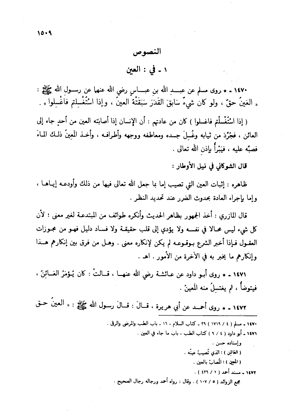 1472 - * روى أحمد عن أبي هريرة، قال: قال رسول الله صلى الله عليه وسلم: "العين حق