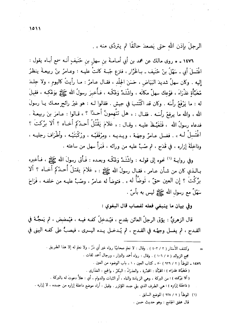 1476 - * روى مالك عن محمد بن أبي أسامة بن سهل بن حنيف أنه سمع أباه يقول: اغتسل أبي - سهل بن حنيف - بالخرار، فنزع جبة كانت عليه؛ وعامر بن ربيعة ينظر إليه. وكان سهل شديد البياض، حسن الجلد، فقال عامر: ما رأيت كاليوم، ولا جلد مخبأة عذراء، فوعك سهل مكانه، واشتد وعكه، فأخبر رسول الله صلى الله عليه وسلم بوعكه، فقيل له: ما يرفع رأسه. وكان قد اكتتب في جيش. فقالوا له: هو غير رائح معك يا رسول الله، والله ما يرفع رأسه. فقال: "هل تتهمون أحدًا؟ " قالوا: عامر بن ربيعة. فدعاه رسول الله، فتغيظ عليه، وقال: "علام يقتل أحدكم أخاه؟ ألا بركت؟ اغتسل له". فغسل عامر وجهه، ويديه، ومرفقيه، وركبتيه، وأطراف رجليه، وداخله إزاره، في قدح، ثم صب عليه من ورائه، فبرأ سهل من ساعته.