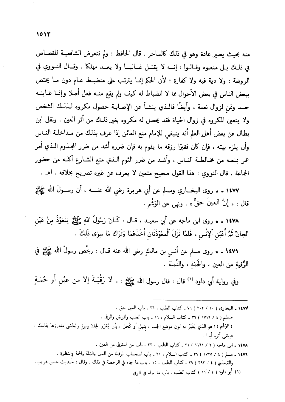 منه بحيث يصير عادة وهو في ذلك كالساحر. قال الحافظ: ولم تتعرض الشافعية للقصاص في ذلك بل منعوه وقالوا: إنه لا يقتل غالبًا ولا يعد مهلكًا. وقال النووي في الروضة: ولا دية فيه ولا كفاترة؛ لأن الحكم إنما يترتب على منضبط عام دون ما يختص ببعض الناس في بعض الأحوال مما لا انضباط له كيف ولم يقع منه فعل أصلًا وإنما غايته حسد وتمن لزوال نعمة، وأيضًا فالذي ينشأ عن الإصابة حصول مكروه لذلك الشخص ولا يتعين المكروه في زوال الحياة فقدي حصل له مكروه بغير ذلك من أثر العين. ونقل ابن بطال عن بعض أهل العلم أنه ينبغي للإمام منع العائن إذا عرف بذلك من مداخلة الناس وأن يلزم بيته، فإن كان فقيرًا رزقه ما يقوم به فإن ضرره أشد من ضرر المجذوم الذي أمر عمر بمنعه من مخالطة الناس، وأشد من ضرر الثوم الذي منع الشارع أكله من حضور الجماعة. قال النووي: هذا القول صحيح متعين لا يعرف عن غيره تصريح بخلافه. أهـ.