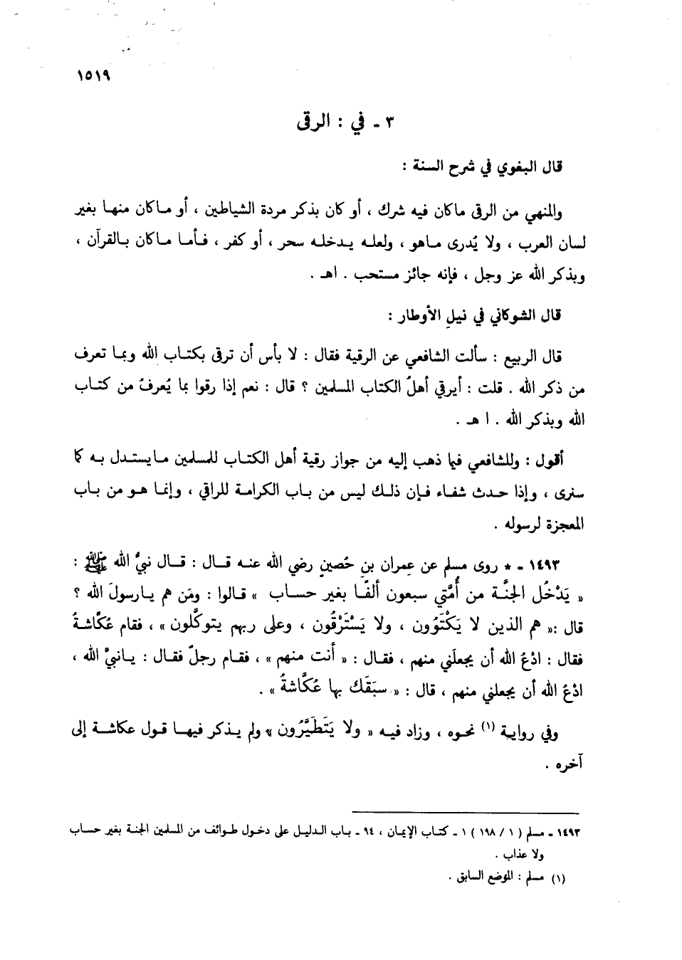 1493 - * روى مسلم عن عمران بن حصين رضي الله عنه قال: قال نبي الله صلى الله عليه وسلم: " يدخل الجنة من أمتي سبعون ألفًا بغير حساب" قالوا: ومن هم يا رسول الله؟ قال: "هم الذين لا يكتوون، ولا يسترقون، وعلى ربهم يتوكلون"، فقام عكاشة فقال: ادع الله أن يجعلني منهم، فقال: "أنت منهم"، فقام رجل فقال: يا نبي الله، ادع الله أن يجعلني منهم، قال: "سبقك بها عكاشة".