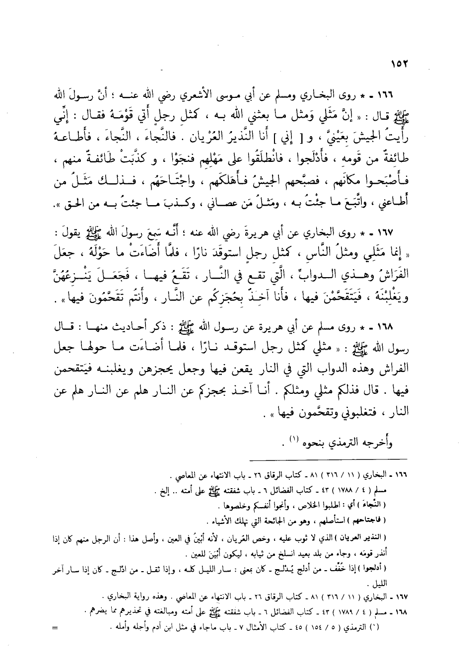 166 - * روى البخاري ومسلم عن أبي موسى الأشعري رضي الله عنه: أن رسول الله صلى الله عليه وسلم قال: "إن مثلي ومثل ما بعثني الله به، كمثل رجل أتي قومه فقال: إني رأيت الجيش بعيني، و [إني] أنا النذير العريان. فالنجاء، النجاء، فأطاعه طائفة من قومه، فأدلجوا، فانطلقوا على مهلهم فنجوا، وكذبت طائفة منهم، فأصبحوا مكانهم، فصبحهم الجيش فأهلكهم، واجتاحهم، فذلك مثل من أطاعني، واتبع ما جئت به، ومثل من عصاني، وكذب ما جئت به من الحق".