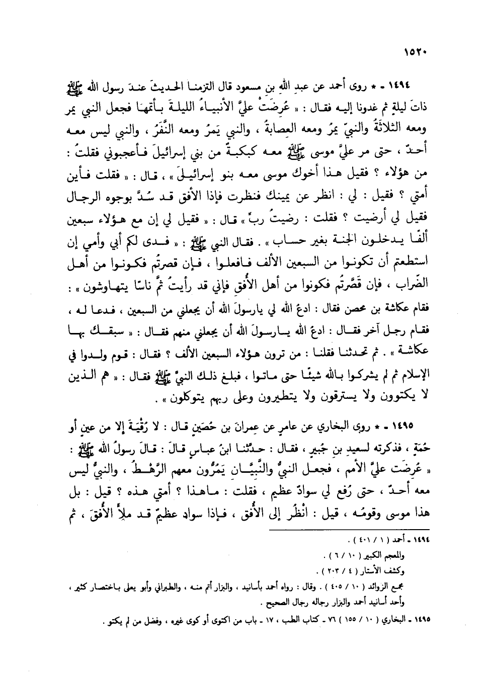 1494 - * روى أحمد عن عبد الله بن مسعود قال التزمنا الحديث عند رسول الله صلى الله عليه وسلم ذات ليلة ثم غدونا إليه فقال: "عرضت على الأنبياء الليلة بأتمها فجعل النبي يمر ومعه الثلاثة والنبي يمر ومعه العصابة، والنبي يمر ومعه النفر، والنبي ليس معه أحد، حتى مر على موسى رضي الله عنه معه كبكبة من بني إسرائيل فأعجبوني فقلت: من هؤلاء؟ فقيل هذا أخوك موسى معه بنو إسرائيل" قال: "فقلت فأين أمتي؟ فقيل: لي: انظر عن يمينك فنظرت فإذا الأفق قد سد بوجوه الرجال فقيل لي أرضيت؟ فقلت: رضيت رب" قال: "فقيل لي إن مع هؤلاء سبعين ألفًا يدخلون الجنة بغير حساب" فقال النبي صلى الله عليه وسلم: "فدى لكم أبي وأمي وإن استطعتم أن تكونوا من السبعين الألف فافعلوا، فإن قصرتم فكونوا من أهل الضراب، فإن قصرتم فكونوا من أهل الأفق فأني قد رأيت ثم ناسًا يتهاوشون": فقام عكاشة بن محصن فقال: ادع الله لي يا رسول الله أن يجعلني من السبعين، فدعا له، فقام رجل آخر فقال: ادع الله يا رسول الله أن يجعلني منهم فقال: "سبقك بها عكاشة". ثم تحدثنا فقلنا: من ترون هؤلاء السبعين الألف؟ فقال: قوم ولدوا في الإسلام ثم لم يشركوا بالله شيئًا حتى ماتوا، فبلغ ذلك النبي صلى الله عليه وسلم فقال: "هم الذين لا يكتوون ولا يسترقون ولا يتطيرون وعلى ربهم يتوكلون".