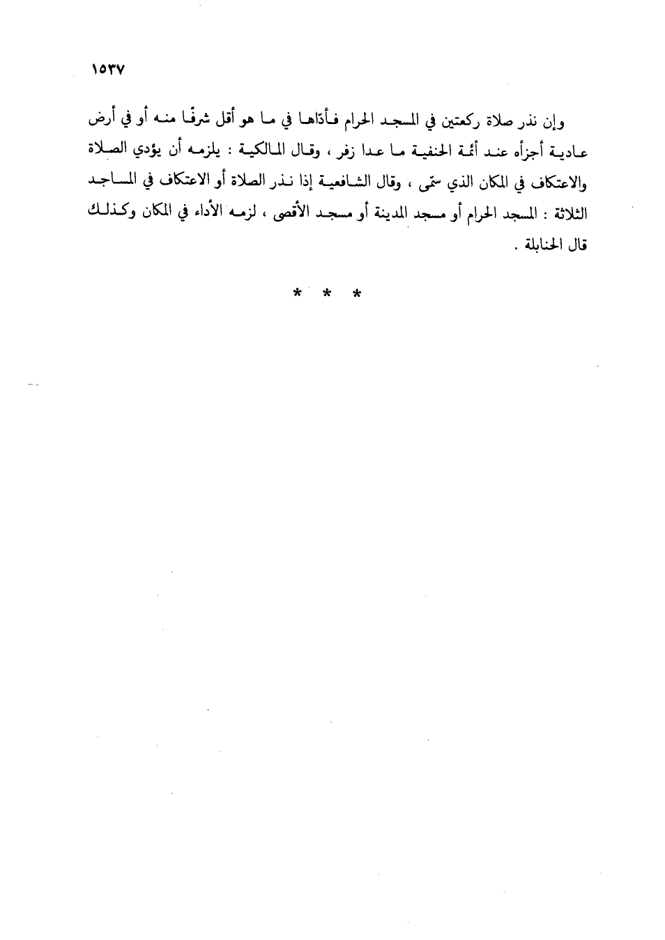 وإن نذر صلاة ركعتين في المسجد الحرام فأداها في ما هو أقل شرفًا منه أو في ارض عادية أجزأه عند أئمة الحنفية ما عدا زفر، وقال المالكية: يلزمه أن يؤدي الصلاة والاعتكاف في المكان الذي سمى، وقال الشافعية إذا نذر الصلاة أو الاعتكاف في المساجد الثلاثة: المسجد الحرام أو مسجد المدينة أو مسجد الأقصى، لزمه الأداء في المكان وكذلك قال الحنابلة.