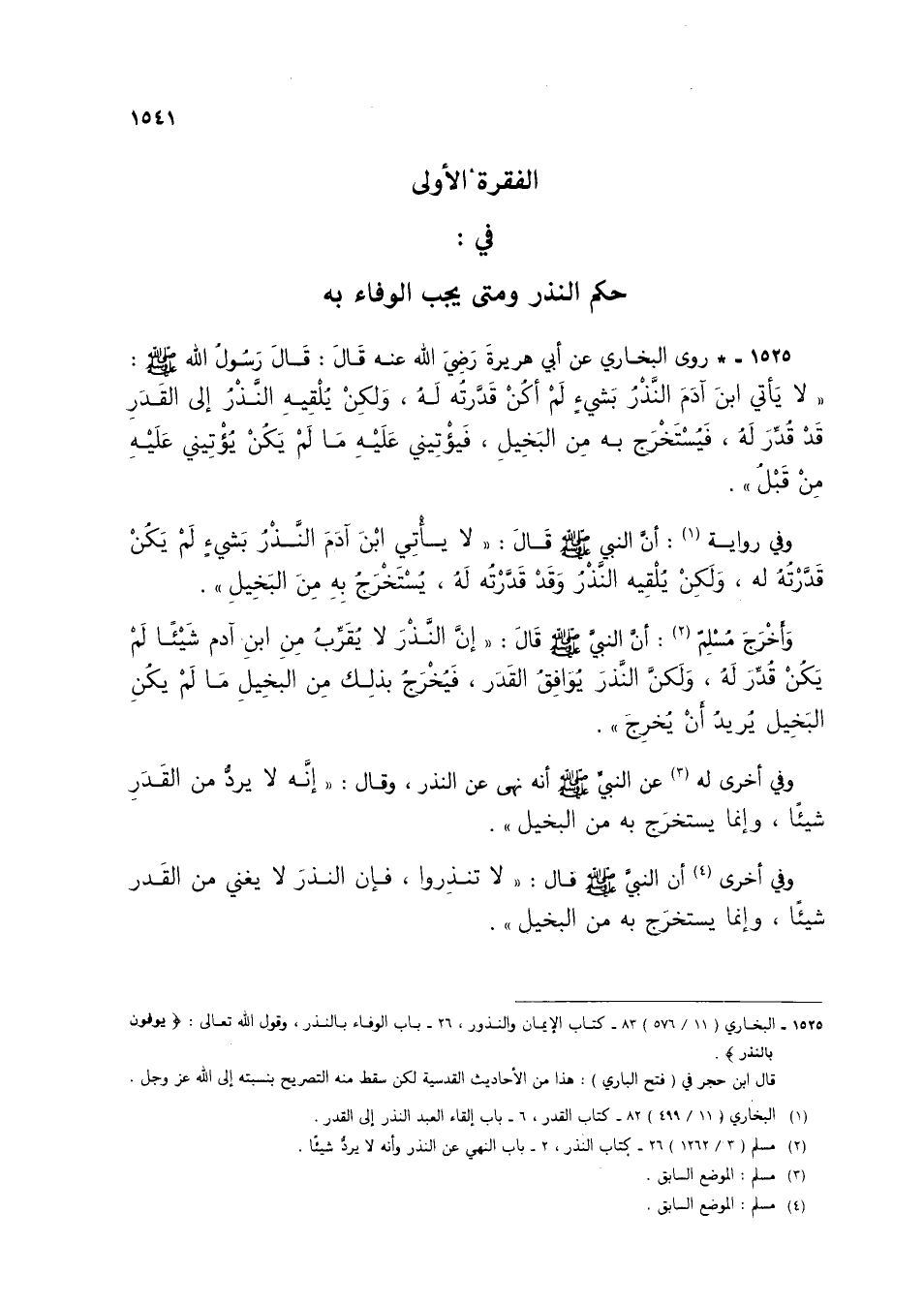 1525 - * روى البخاري عن أبي هريرة رضي الله عنه قال: قال رسول الله صلى الله عليه وسلم: "لا يأتي ابن آدم النذر بشيء لم أكن قدرته له، ولكن يلقيه النذر إلى القدر قد قدر له، فيستخرج به من البخيل، فيؤتيني عليه ما لم يكن يؤتيني عليه من قبل".