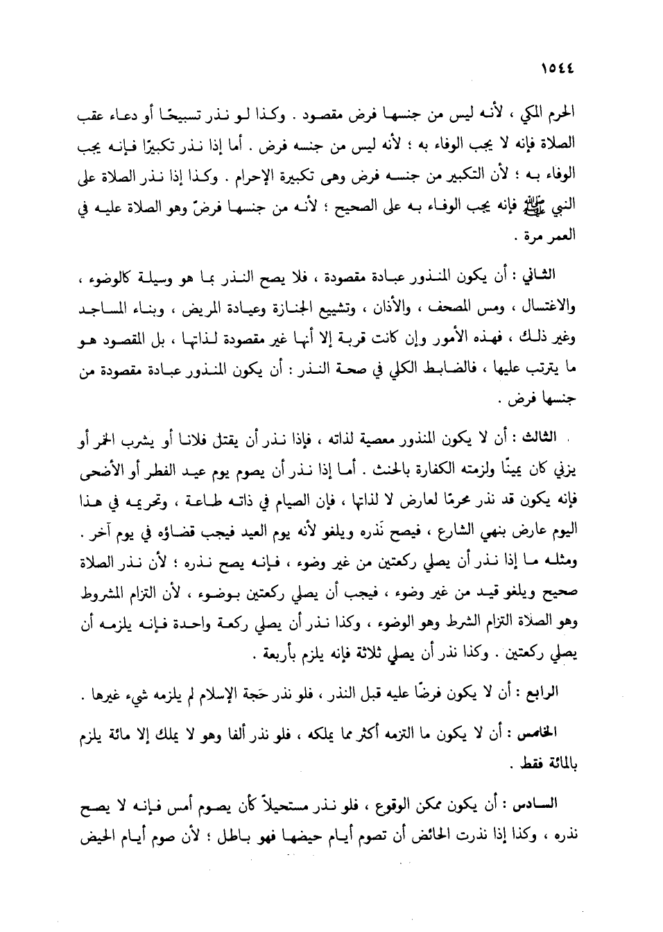 الثالث: أن لا يكون المنذور معصية لذاته، فإذا نذر أن يقتل فلانا أو يشرب الخمر أو يزني كان يمينًا ولزمته الكفارة بالحنث. أما إذا نذر أن يصوم يوم عيد الفطر أو الأضحى فإنه يكون قد نذر محرمًا لعارض لا لذاتها، فإن الصيام في ذاته طاعة، وتحريمه في هذا اليوم عارض بنهي الشارع، فيصح نذره ويلغو لأنه يوم العيد فيجب قضاؤه في يوم آخر. ومثله ما إذا نذر أن يصلي ركعتين من غير وضوء، فإنه يصح نذره؛ لأن نذر الصلاة صحيح ويلغو قيد من غير وضوء، فيجب أن يصلي ركعتين بوضوء، لأن التزام المشروط وهو الصلاة التزام الشرط وهو الوضوء، وكذا نذر أن يصلي ركعة واحدة فإنه يلزمه أن يصلي ركعتين. وكذا نذر أن يصلي ثلاثة فإنه يلزم بأربعة.