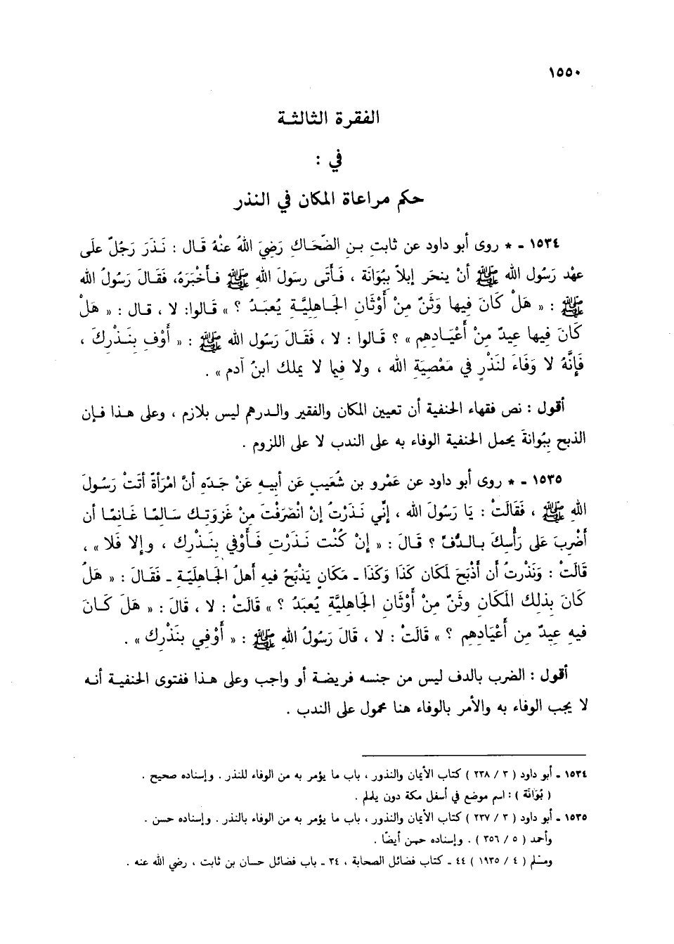 1535 - * روى أبو داود عن عمرو بن شعيبٍ عن أبيه عن جده أن امرأة أتت رسول الله صلى الله عليه وسلم، فقالت: يا رسول الله، إني نذرت إن انصرفت من غزوتك سالمًا غانمًا أن أضرب على رأسك بالدف؟ قال: "إن كنت نذرت فأوفي بنذرك، وإلا فلا"، قالت: ونذرت أن أذبح لمكان كذا وكذا- مكانٍ يذبح فيه أهل الجاهلية- فقال: "هل كان بذلك المكان وثنٌ من أوثان الجاهلية يعبد؟ " قالت: لا، قال: "هل كان فيه عيدٌ من أعيادهم؟ " قالت: لا، قال رسول الله صلى الله عليه وسلم: "أوفي بنذرك".