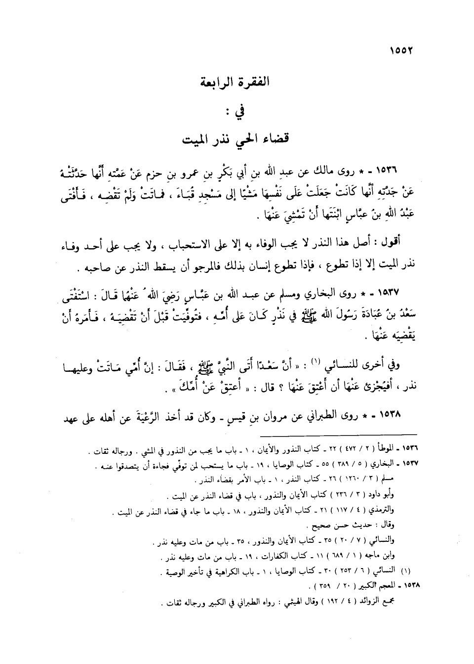 1537 - * روى البخاري ومسلم عن عبد الله بن عباسٍ رضي الله عنهما قال: استفتى سعد بن عبادة رسول الله صلى الله عليه وسلم في نذرٍ كان على أمه، فتوفيت قبل أن تقضيه، فأمره أن يقضيه عنها.