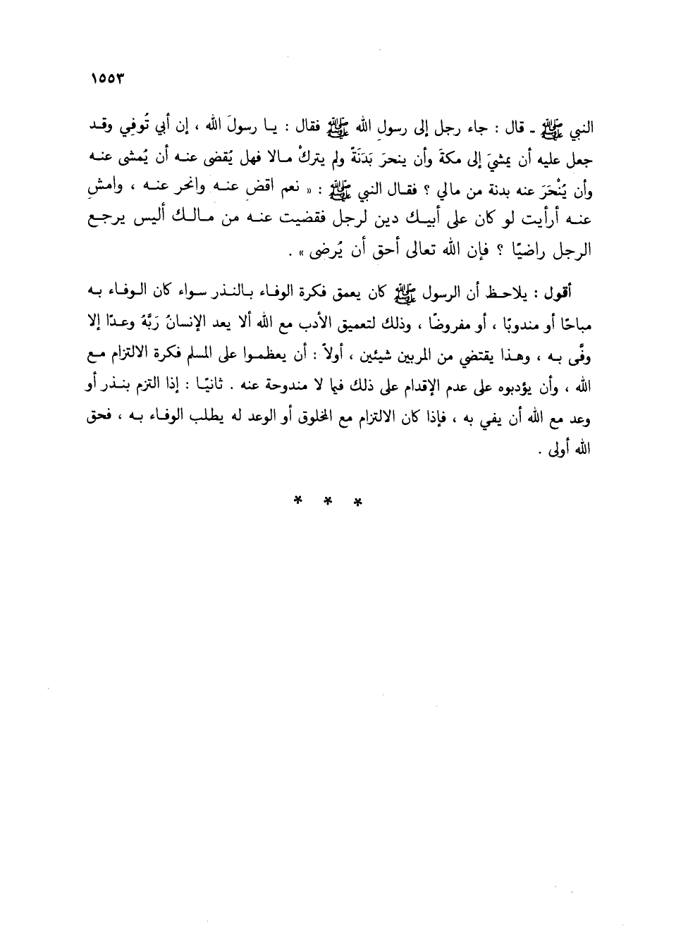 أقول: يلاحظ أن الرسول صلى الله عليه وسلم كان يعمق فكرة الوفاء بالنذر سواء كان الوفاء به مباحًا أو مندوبًا، أو مفروضًا، وذلك لتعميق الأدب مع الله ألا يعد الإنسان ربه وعدًا إلا وفى به، وهذا يقتضي من المربين شيئين، أولًا: أن يعظموا على المسلم فكرة الالتزام مع الله، وأن يؤدبوه على عدم الإقدام على ذلك فيما لا مندوحة عنه. ثانيًا: إذا التزم بنذر أو وعد مع الله أن يفي به، فإذا كان الالتزام مع المخلوق أو الوعد له يطلب الوفاء به، فحق الله أولى.