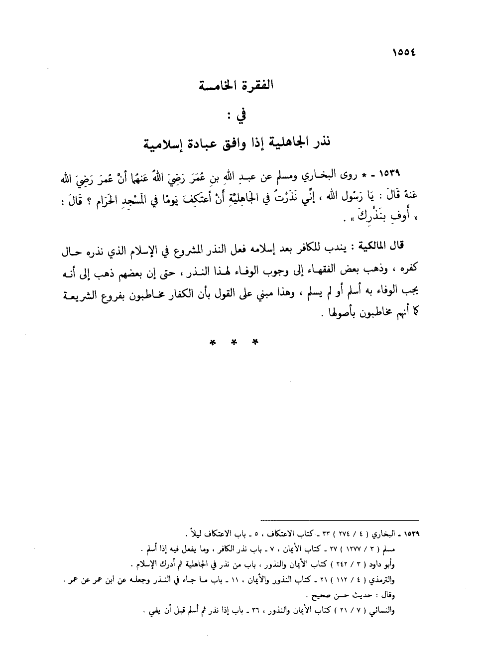 1539 - * روى البخاري ومسلم عن عبد الله بن عمر رضي الله عنهما أن عمر رضي الله عنه قال: يا رسول الله، إني نذرت في الجاهلية أن اعتكف يومًا في المسجد الحرام؟ قال: "أوف بنذرك".