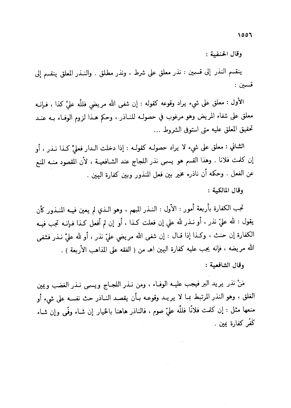 الأول: معلق على شيء يراد وقوعه كقوله: إن شفى الله مريضي فلله علي كذا، فإنه معلق على شفاء المريض وهو مرغوب في حصوله للناذر.، وحكم هذا لزوم الوفاء به عند تحقيق المعلق عليه متى استوفى الشروط ...