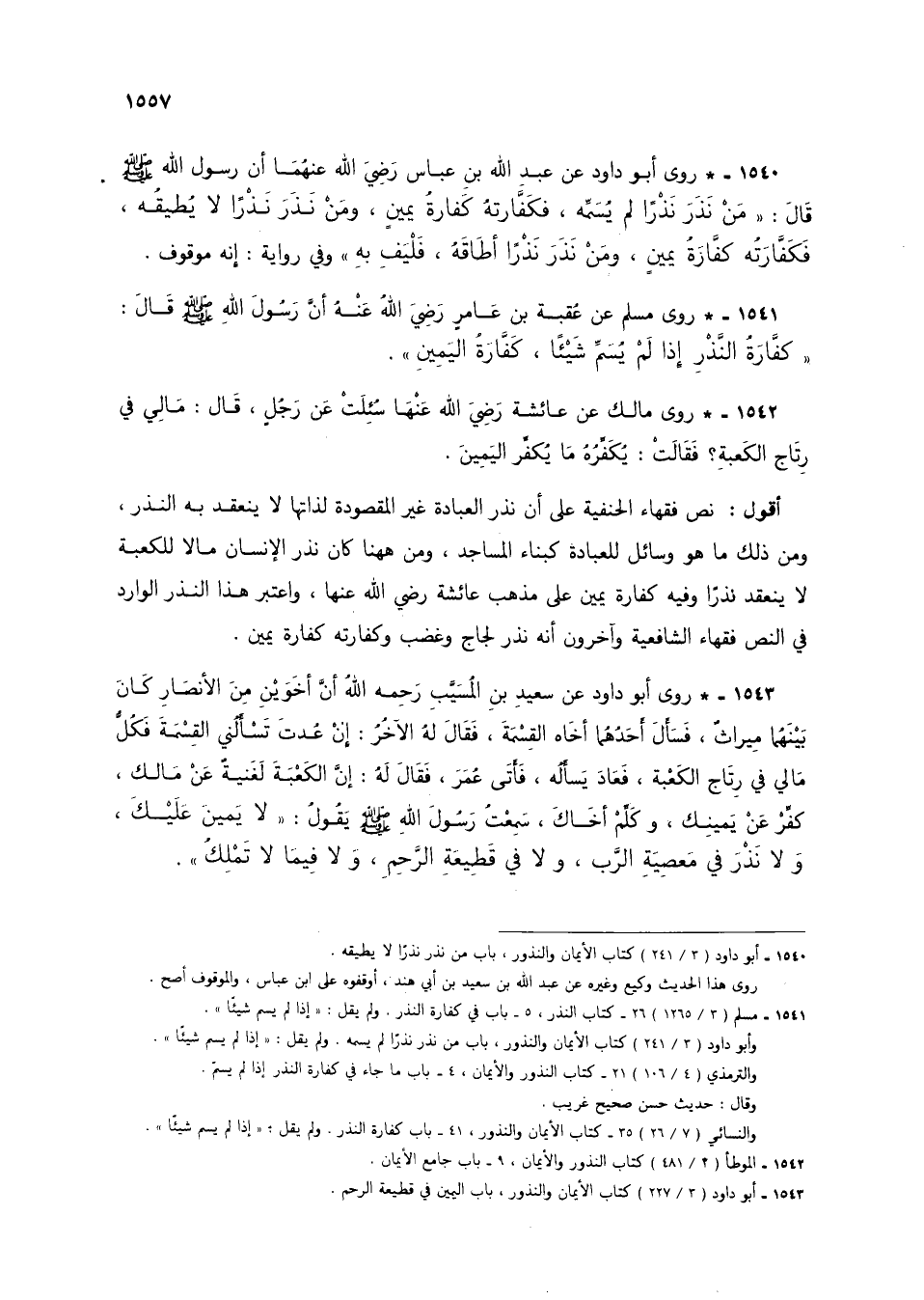 1541 - * روى مسلم عن عقبة بن عامرٍ رضي الله عنه أن رسول الله صلى الله عليه وسلم قال: "كفارة النذر إذا لم يسم شيئًا، كفارة اليمين".