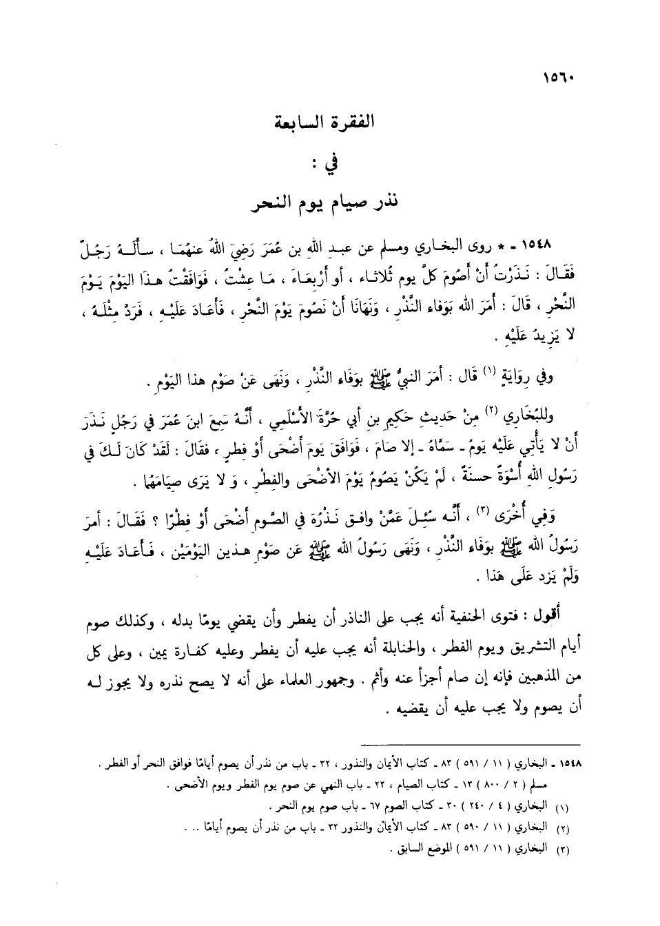 1548 - * روى البخاري ومسلم عن عبد الله بن عمر رضي الله عنهما، سأله رجلٌ فقال: نذرت أن أصوم كل يوم ثلاثاء، أو أربعاء، ما عشت، فوافقت هذا اليوم يوم النحر، قال: أمر الله بوفاء النذر، ونهانا أن نصوم يوم النحر، فأعاد عليه، فرد مثله، لا يزيد عليه.