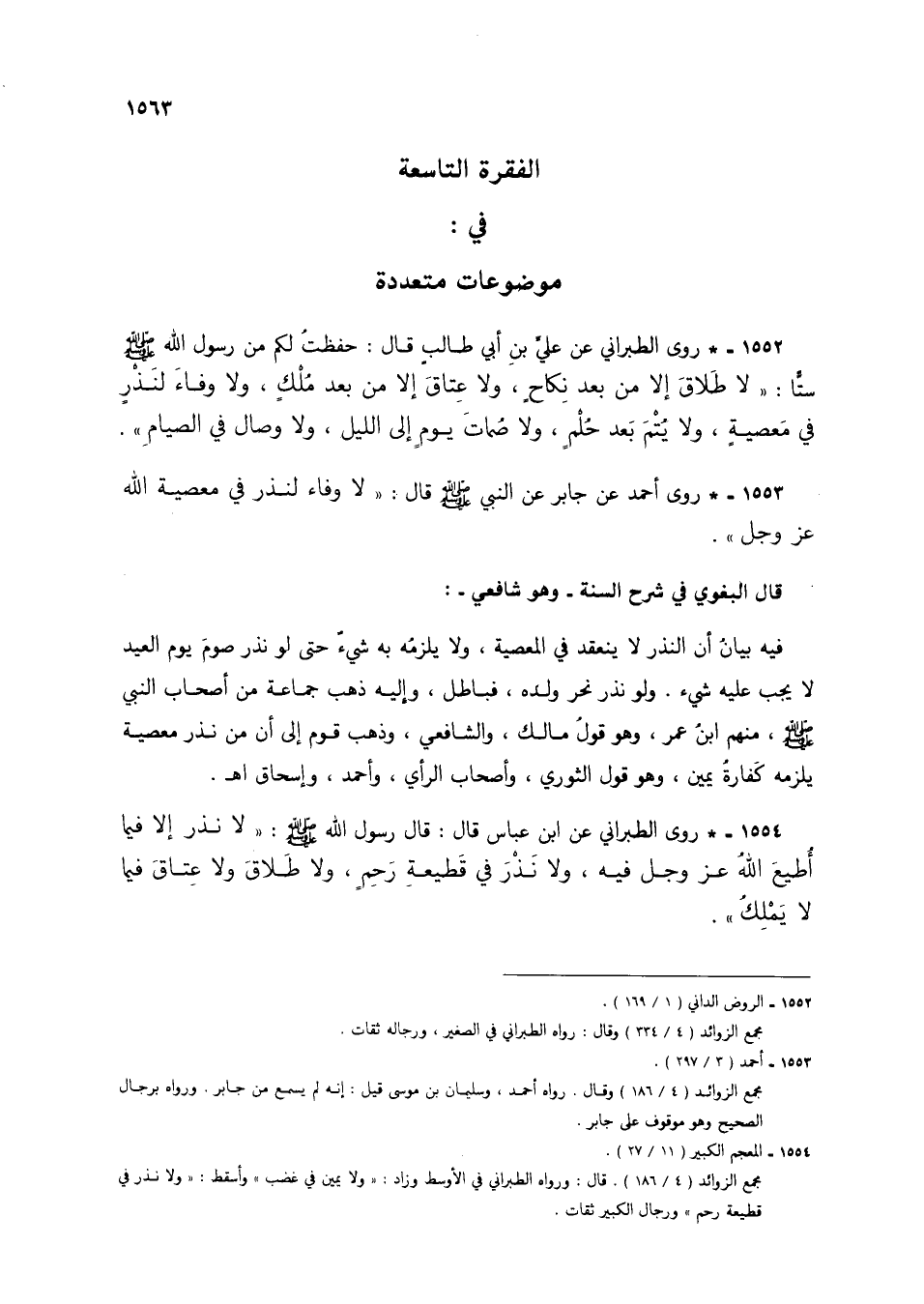 1553 - * روى أحمد عن جابر عن النبي صلى الله عليه وسلم قال: "لا وفاء لنذر في معصية الله عز وجل".