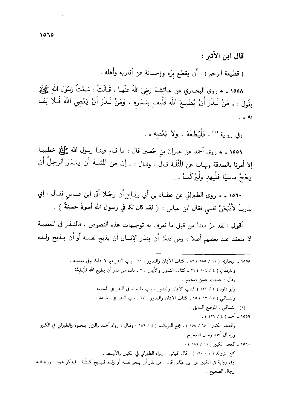 1558 - * روى البخاري عن عائشة رضي الله عنها، قالت: سمعت رسول الله صلى الله عليه وسلم يقول: "من نذر أن يطيع الله فليف بنذره، ومن نذر أن يعصي الله فلا يف به".