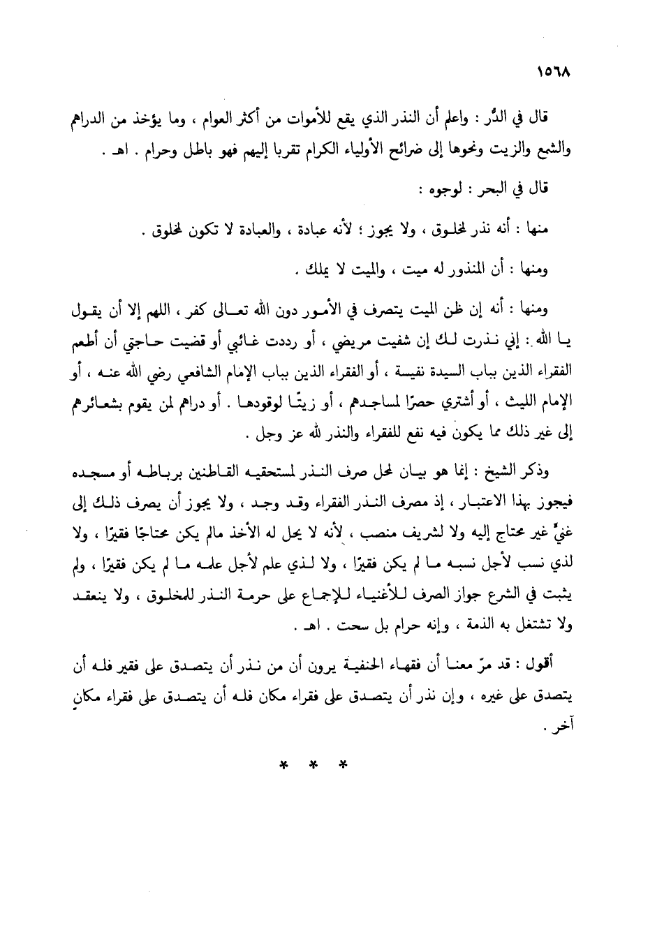 ومنها: أنه إن ظن الميت يتصرف في الأمور دون الله تعالى كفر، اللهم إلا أن يقول يا الله: إني نذرت لك إن شفيت مريضي، أو رددت غائبي أو قضيت حاجتي أن أطعم الفقراء الذين بباب السيدة نفيسة، أو الفقراء الذين بباب الإمام الشافعي رضي الله عنه، أو الإمام الليث، أو أشتري حصرًا لمساجدهم، أو زيتًا لوقودها. أو دراهم لمن يقوم بشعائرهم إلى غير ذلك مما يكون فيه نفع للفقراء والنذر لله عز وجل.
