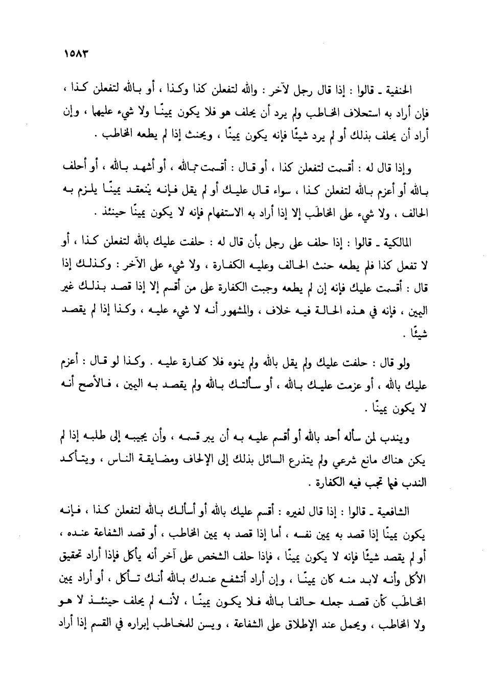 المالكية- قالوا: إذا حلف على رجل بأن قال له: حلفت عليك بالله لتفعلن كذا، أو لا تفعل كذا فلم يطعه حنث الحالف وعليه الكفارة، ولا شيء على الآخر: وكذلك إذا قال: أقسمت عليك فإنه إن لم يطعه وجبت الكفارة على من أقسم إلا إذا قصد بذلك غير اليمين، فإنه في هذه الحالة فيه خلاف، والمشهور أنه لا شيء عليه، وكذا إذا لم يقصد شيئًا.