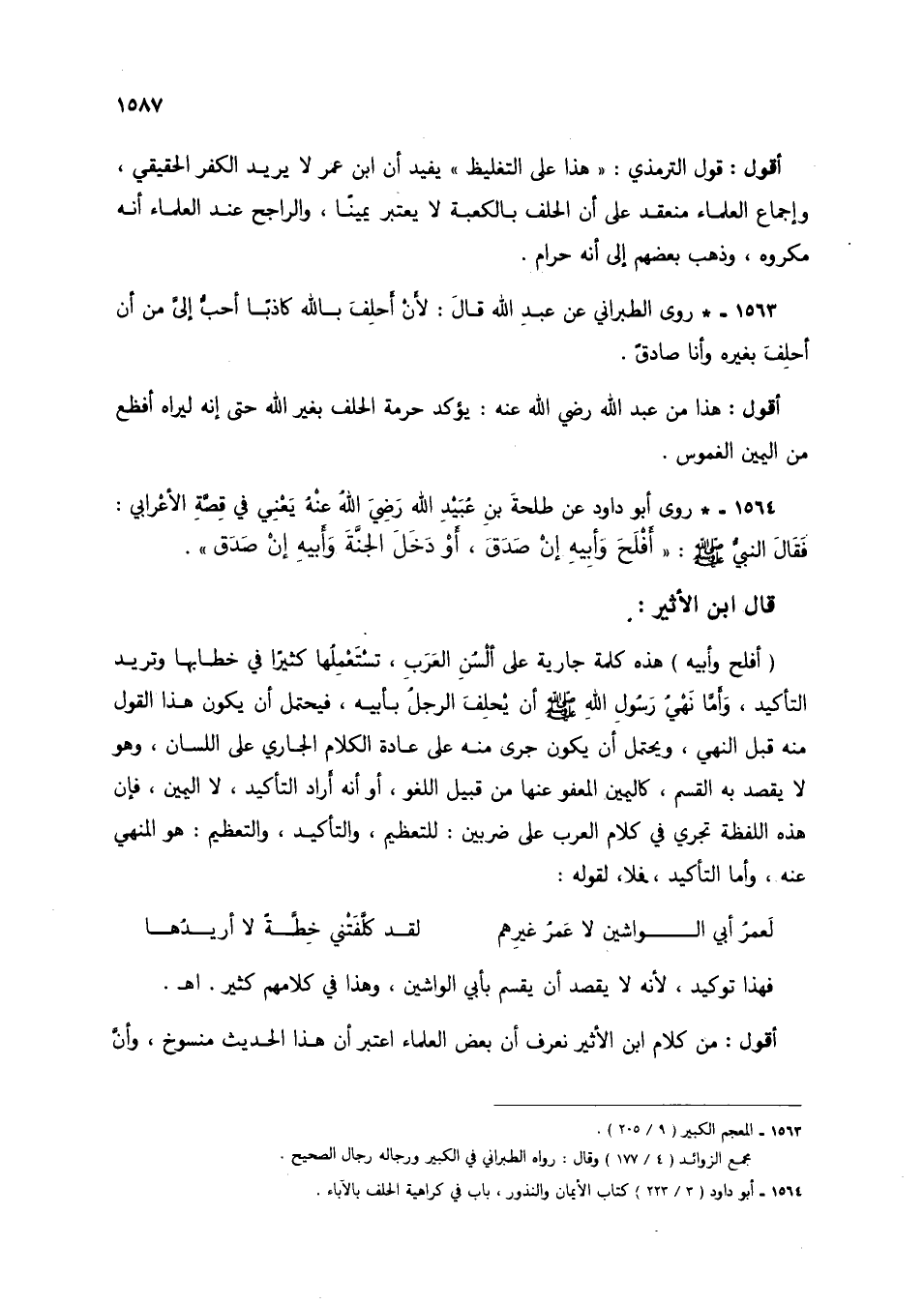 1563 - * روى الطبراني عن عبد الله قال: لأن أحلف بالله كاذبا أحب إلى من أن أحلف بغيره وأنا صادق.