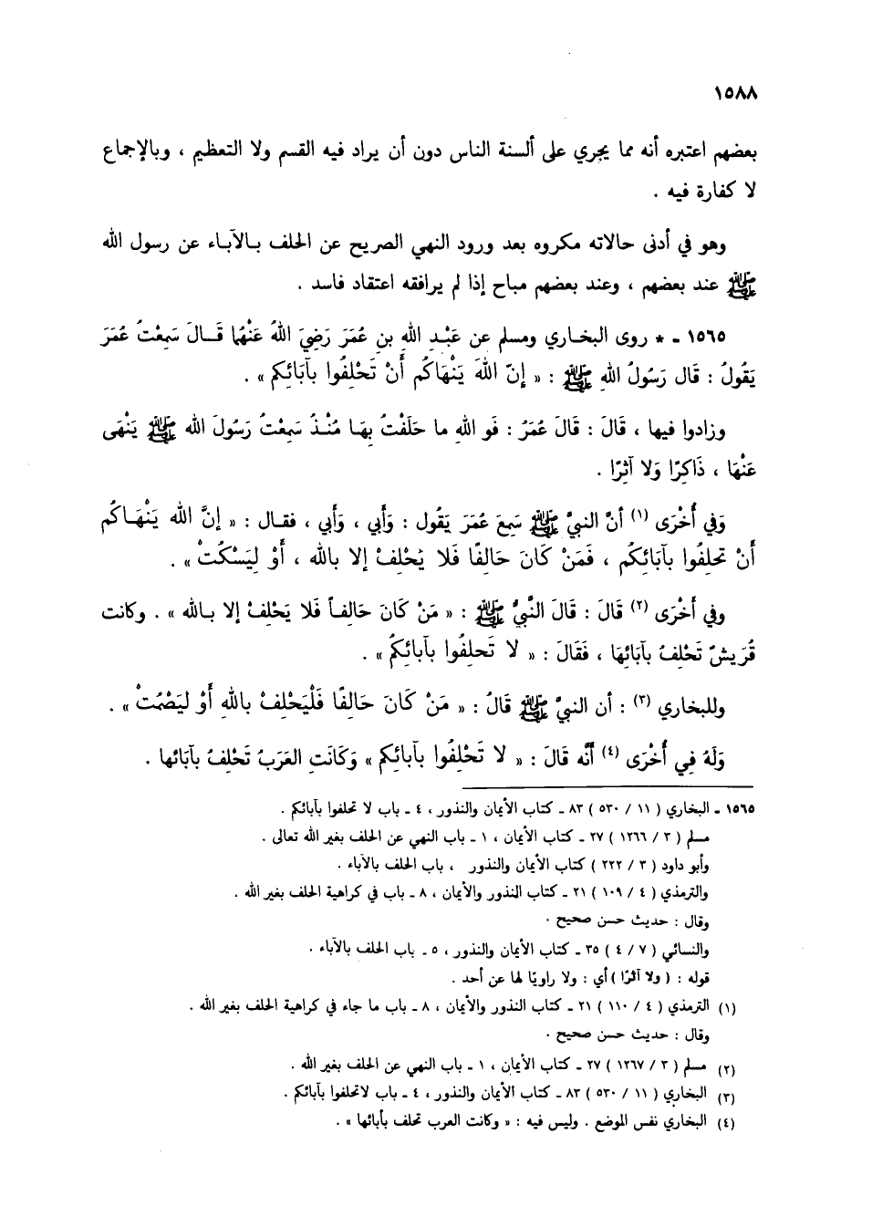 1565 - * روى البخاري ومسلم عن عبد الله بن عمر رضي الله عنهما قال سمعت عمر يقول: قال رسول الله صلى الله عليه وسلم: "إن الله ينهاكم أن تحلفوا بآبائكم".