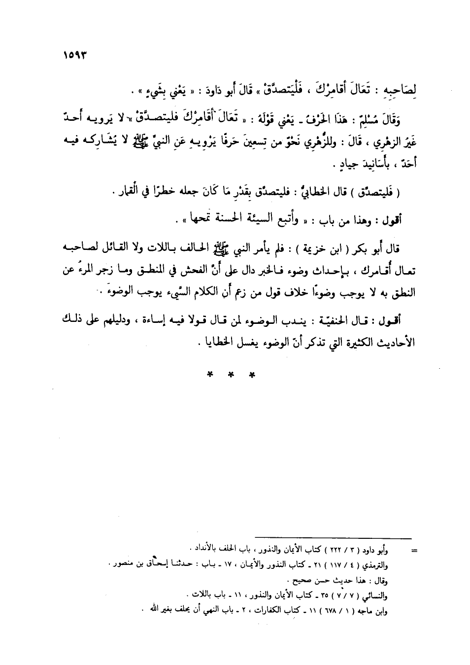 قال أبو بكر (ابن خزيمة): فلم يأمر النبي صلى الله عليه وسلم الحالف باللات ولا القائل لصاحبه تعالى أقامرك، بإحداث وضوء فالخبر دال على أن الفحش في المنطق وما زجر المرء عن النطق به لا يوجب وضوءًا خلاف قول من زعم أن الكلام السيئ يوجب الوضوء.