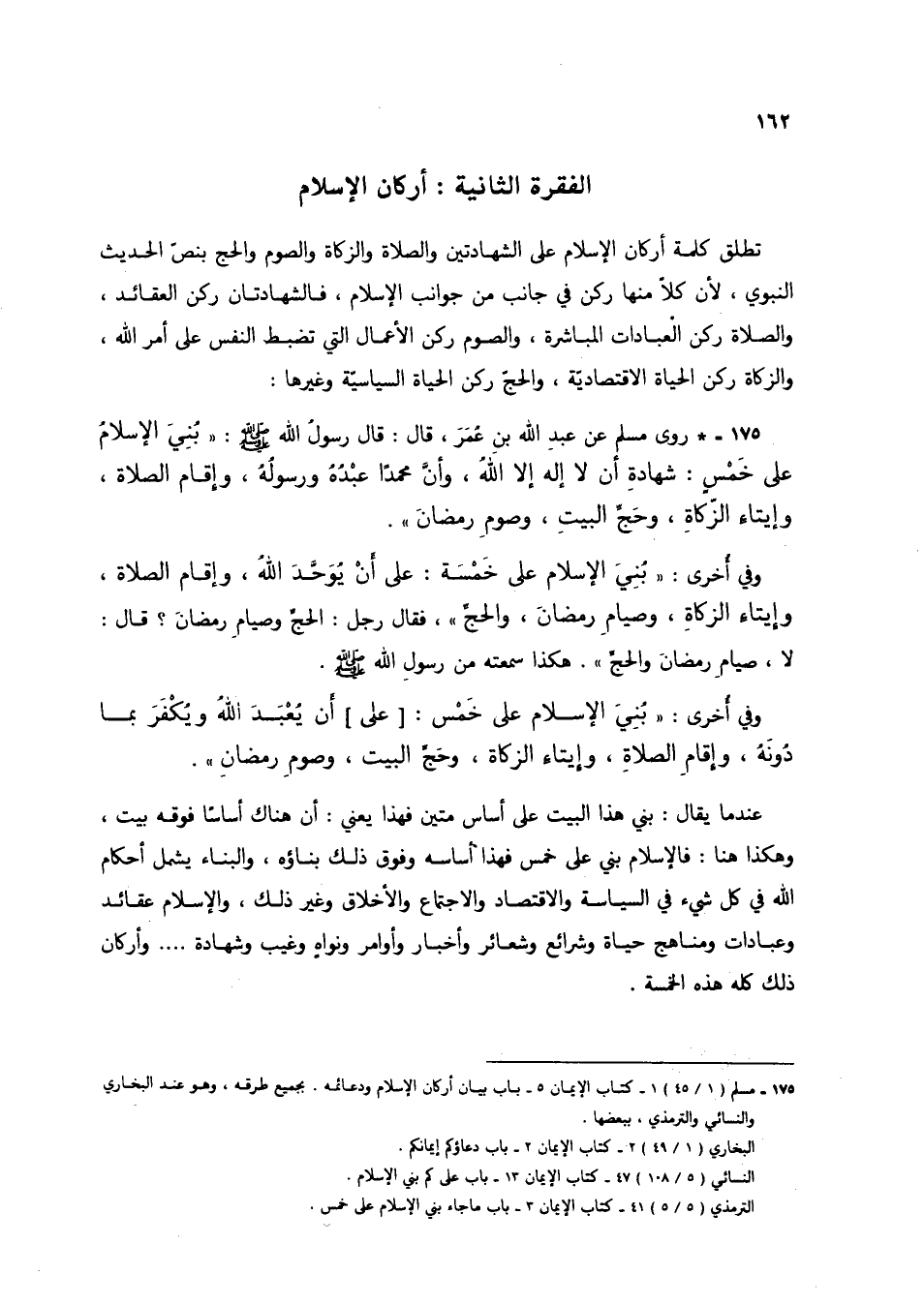 175 - * روى مسلم عن عبد الله بن عمر، قال: قال رسول الله صلى الله عليه وسلم: "بني الإسلام على خمس: شهادة أن لا إله إلا الله، وأن محمداً عبده ورسوله، وإقام الصلاة، وإيتاء الزكاة، وحج البيت، وصوم رمضان".