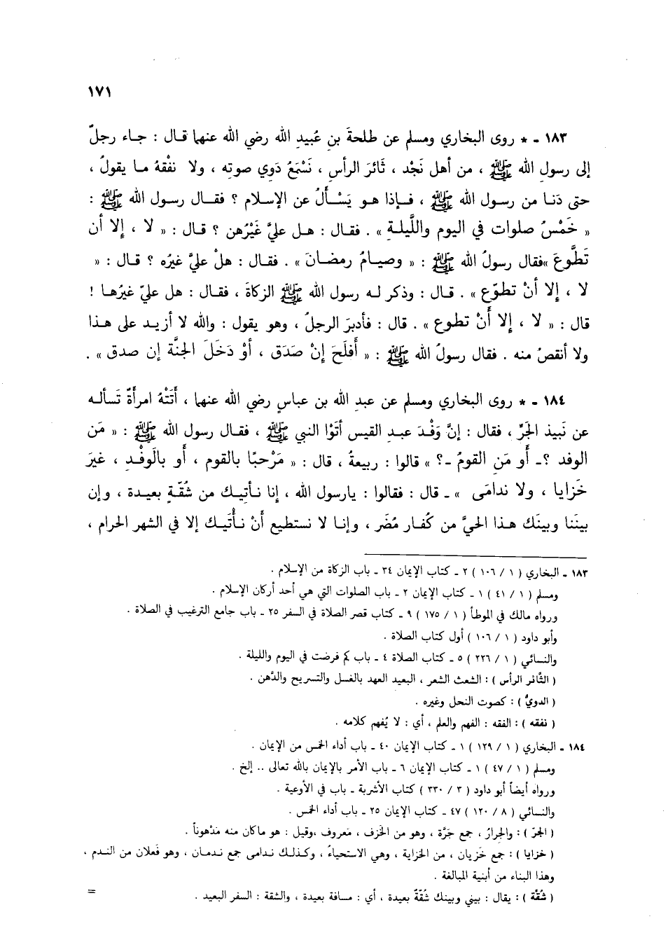 183 - * روى البخاري ومسلم عن طلحة بن عبيد الله رضي الله عنهما قال: جاء رجل إلى رسول الله صلى الله عليه وسلم، من أهل نجد، ثائر الرأس، نسمع دوي صوته، ولا نفقه ما يقول، حتى دنا من رسول الله صلى الله عليه وسلم، فإذا هو يسأل عن الإسلام؟ فقال رسول الله صلى الله عليه وسلم: "خمس صلوات في اليوم والليلة" فقال: هل علي غيرهن؟ قال: "لا، إلا أن تطوع" فقال رسول الله صلى الله عليه وسلم: "وصيام رمضان" فقال: هل علي غيره؟ قال: "لا، إلا أن تطوع" قال: وذكر له رسول الله صلى الله عليه وسلم الزكاة، فقال: هل علي غيرها! قال: "لا، إلا أن تطوع" قال: فأدبر الرجل، وهو يقول: والله لا أزيد على هذا ولا أنقص منه. فقال رسول الله صلى الله عليه وسلم: "أفلح إن صدق، أو دخل الجنة إن صدق".