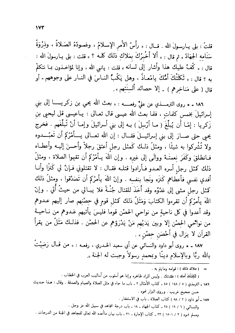 187 - * روى أبو داود والنسائي عن أبي سعيد الخدري، رفعه: "من قال رضيت بالله ربا وبالإسلام دينا وبمحمد رسولاً وجبت له الجنة".
