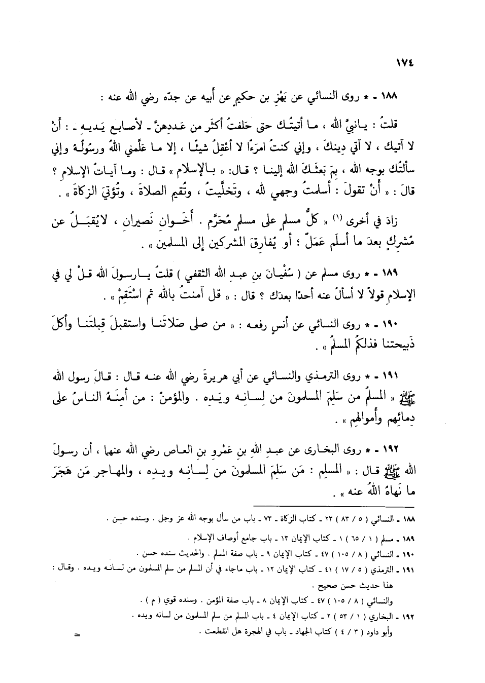 191 - * روى الترمذي والنسائي عن أبي هريرة رضي الله عنه قال: قال رسول الله صلى الله عليه وسلم "المسلم من سلم المسلمون من لسانه ويده، والمؤمن: من أمنة الناس على دمائهم وأموالهم".