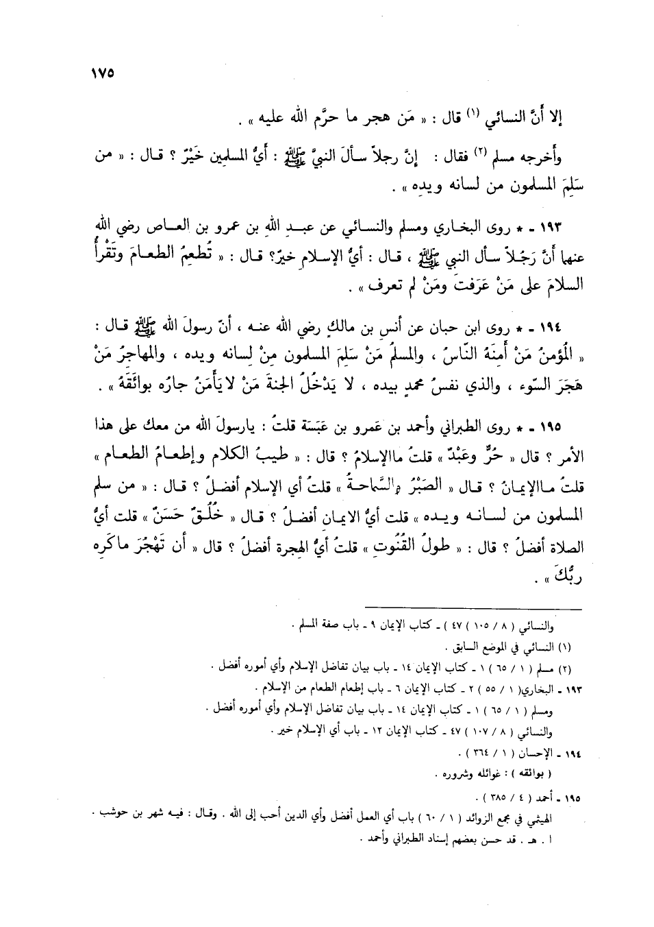 193 - * روى البخاري ومسلم النسائي عبد الله بن عمرو بن العاص رضي الله عنها أن رجلا سأل النبي صلى الله عليه وسلم، وقال: أي الإسلام خير؟ قال: "تطعم الطعام وتقرأ السلام على من عرفت ومن لم تعرف"