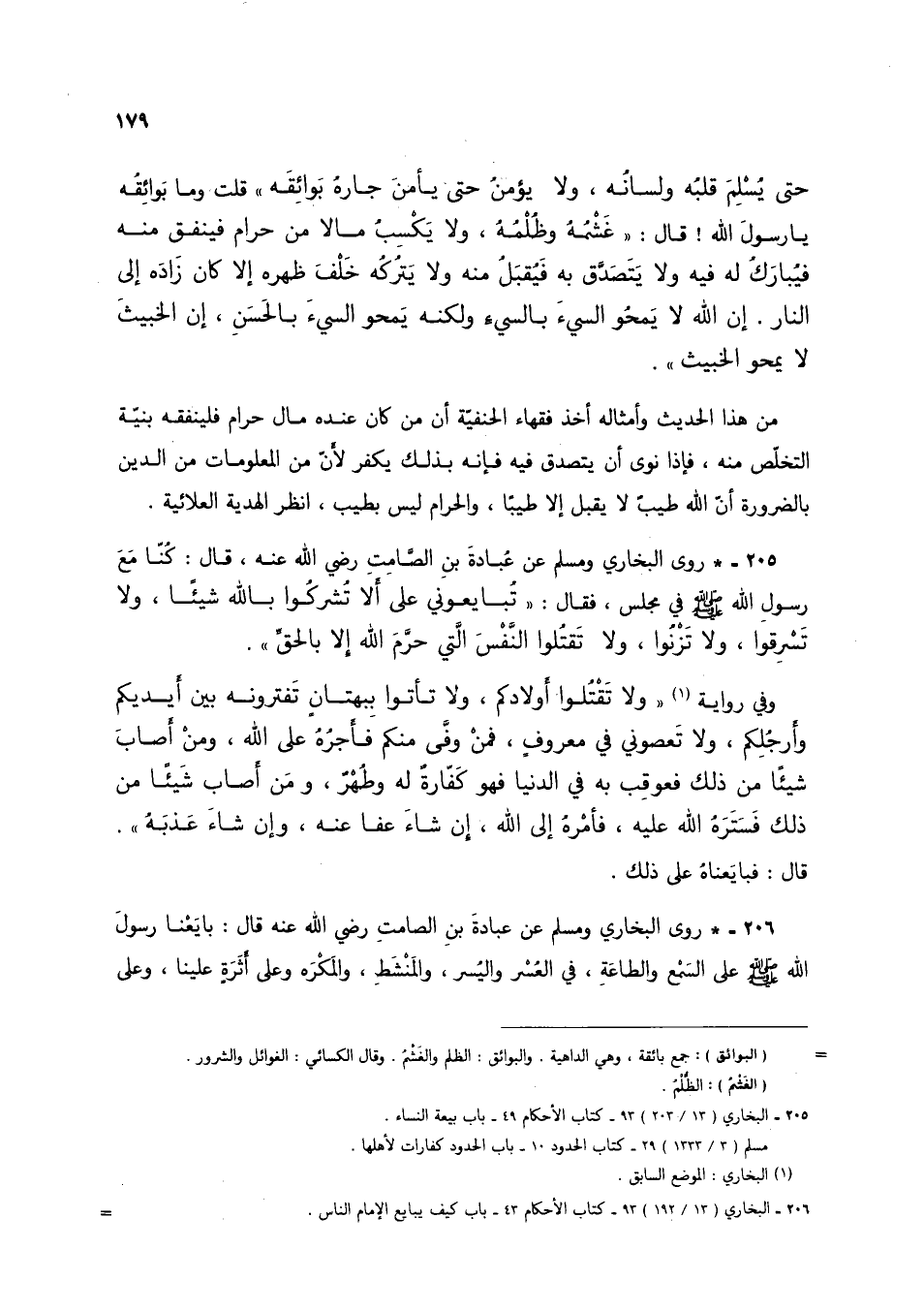 206 - * روى البخاري ومسلم عن عبادة بن الصامت رضي الله عنه قال: بايعنا رسول الله صلى الله عليه وسلم على السمع والطاعة، في العسر واليسر، والمنشط، والمكره وعلى أثرة علينا، وعلى