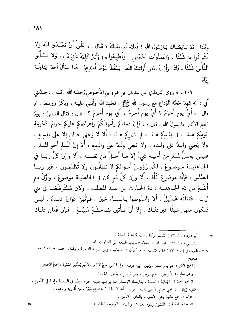 209 - * روى الترمذي عن سليمان بن عمرو بن الأحوص رحمة الله، قال: حدثني أي: أنه شهد حجة الوداع مع رسول صلى الله عليه وسلم فحمد الله وأثنى عليه، وذكر ووعظ، ثم قال: "أي يوم أحرم؟ أي يوم أحرم؟ أي يوم أحرم؟ " قال: فقال الناس: يوم الحج الأكبر يا رسول الله، قال: "فإن دماءكم وأموالكم وأعراضكم عليكم حرام كحرمة يومكم هذا، في بلدكم هذا، وفي شهركم هذا، ألا لا يجني جان إلا على نفسه، ولا يجني والد على ولده، ولا يجني ولده على والده، ألا إن المسلم أخو المسلم، فليس يحل لمسلم من أخيه شيء إلا ما أحل من نفسه، ألا وأن كل ربا في الجاهلية موضوع لكم رؤوس أموالكم لا تظلمون ولا تظلمون، غير ربا العباس، فإنه موضوع كلخ، ألا وإن كل دم كان في الجاهلية موضوع، وأول دم أضع من دم الجاهلية: دم الحارث بن عبد المطلب، وكان مسترضعا في بني ليث، فقتلته هذيل، ألا واستوصوا بالنساء خيرا، فإنهن عوان عندكم، ليس تملكون منهن شيئاً غير ذلك، إلا أن يأتين بفاحشة مبينة، فإن فعلن ذلك