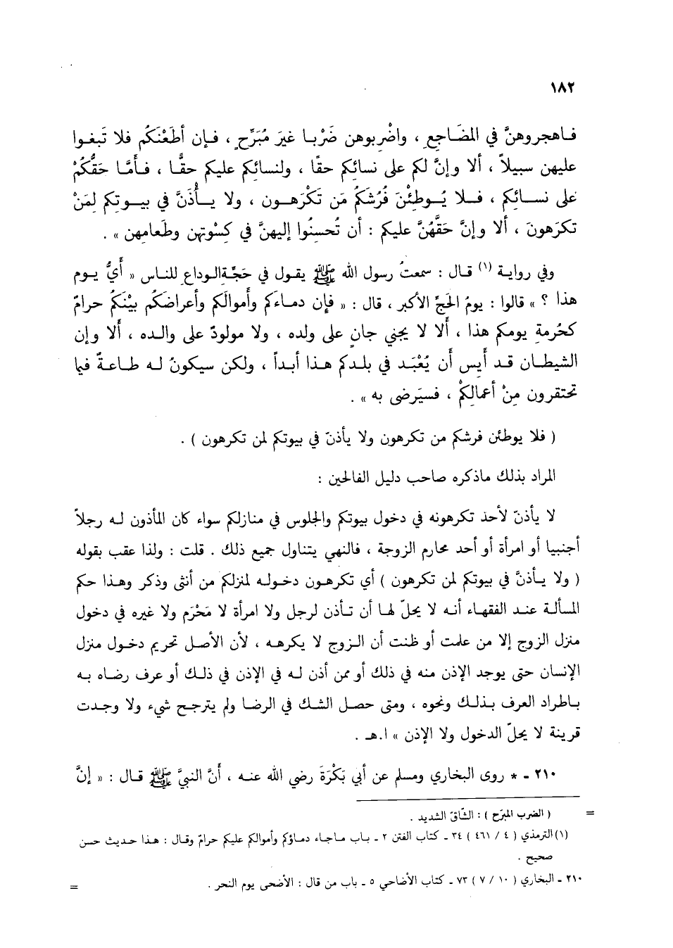 فاهجروهن في المضاجع، واضربوهن ضرباً غير مبرح، فإن أطعنكم فلا تبغوا عليهن سبيلاً، ألا وإن لكم على نسائكم حقاً، ولنسائكم عليكم حقا، فأما حقكم على نسائكم، فلا يوطئن فرشكم من تكرهون ولا يأذن في بيوتكم لمن تكرهون، ألا وإن حقهن عليكم: أن تحسنوا إليهن في كسوتهن وطعامهن".