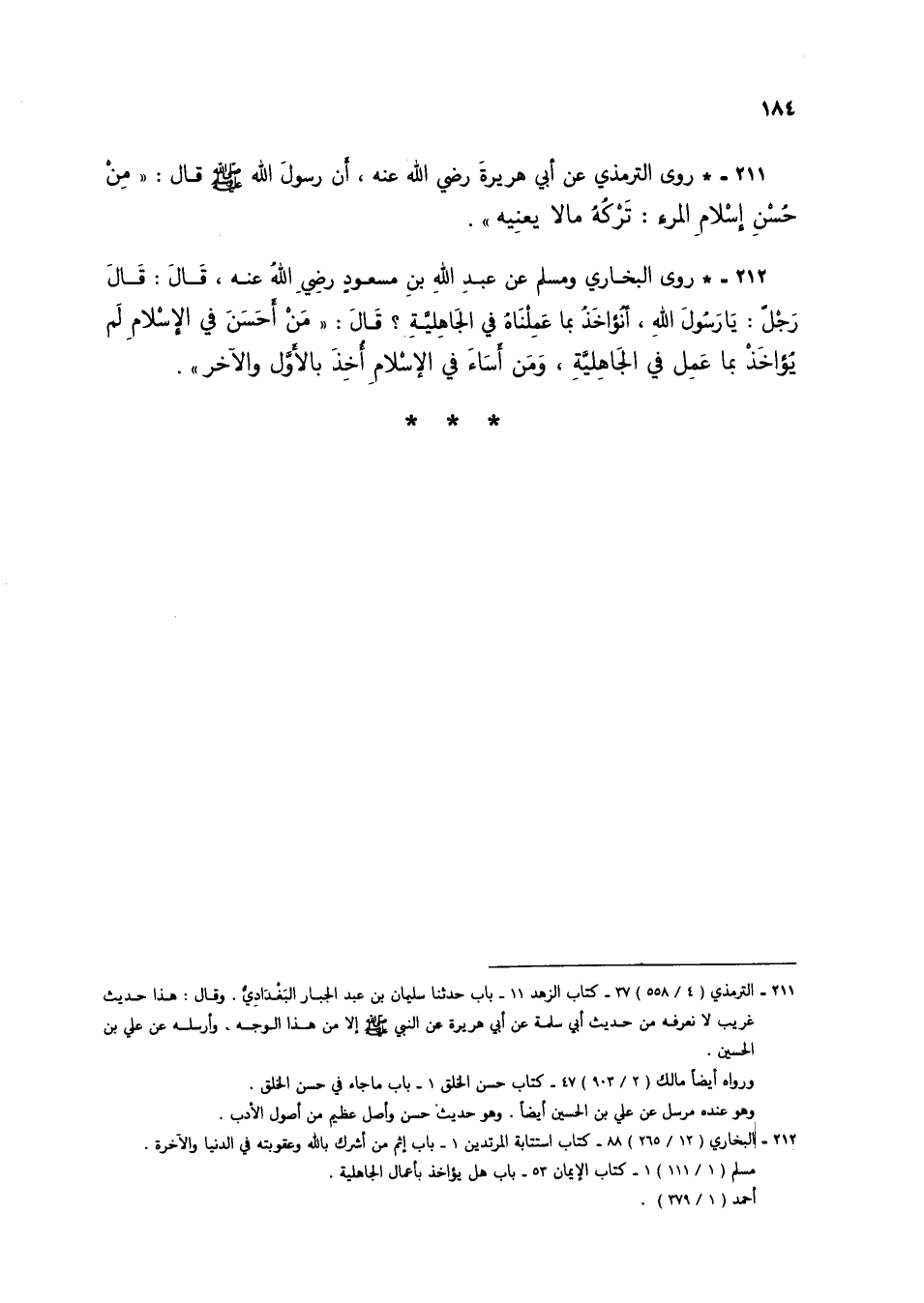 211 - * روى الترمذي عن أبي هريرة رضي الله عنه، أن رسول الله صلى الله عليه وسلم قال: "من حسن إسلام المرء: تركه ما لا يعنيه".