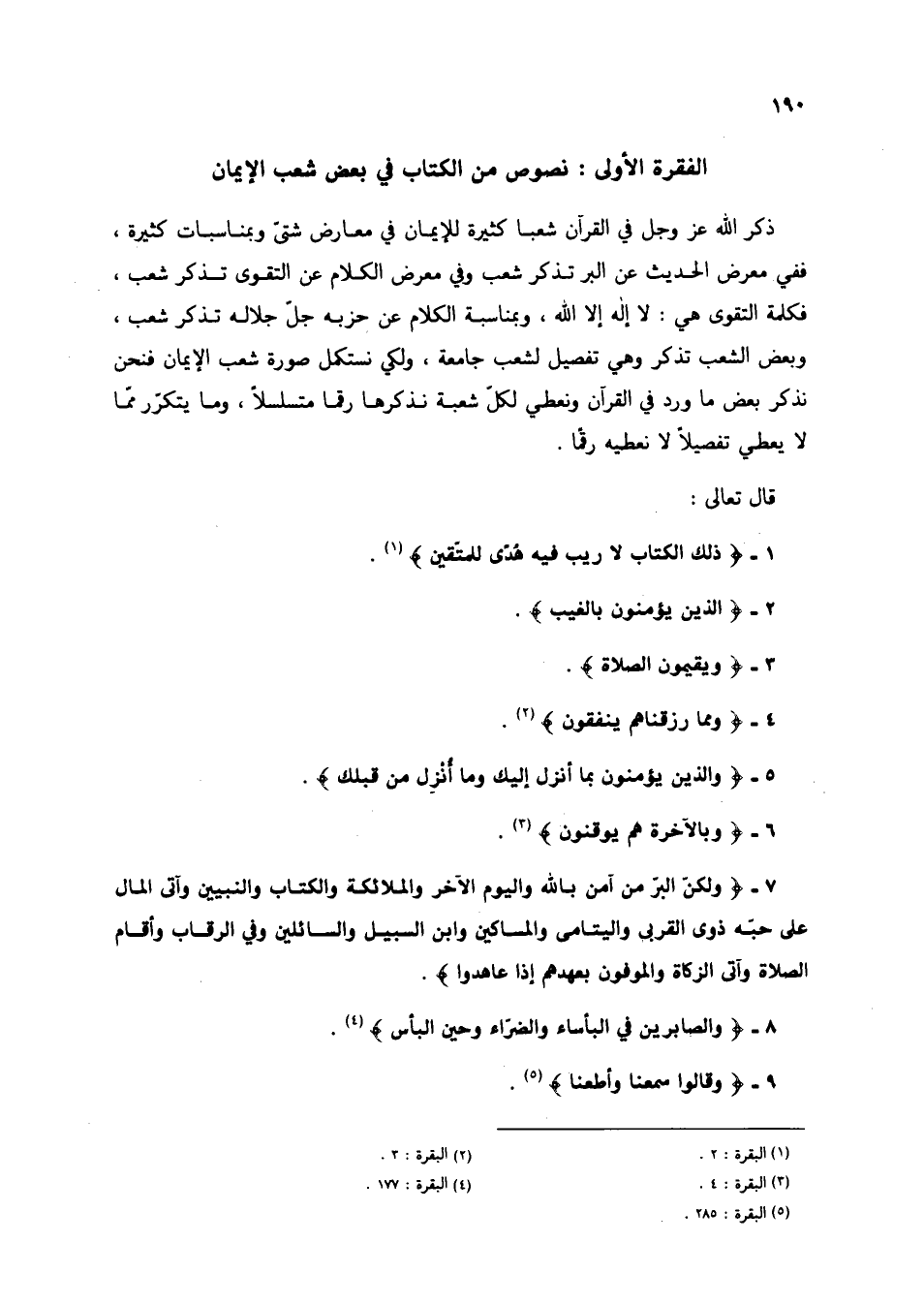 ذكر الله عز وجل في القرآن شعبا كثيرة للإيمان في معارض شتى وبمناسبات كثيرة، ففي معرض الحديث عن البر تذكر شعب وفي معرض الكلام عن التقوى تذكر شعب، فكلمة التقوى هي: لا إله إلا الله، وبمناسبة الكلام عن حزبه جل جلاله تذكر شعب، وبعض الشعب تذكر وهي تفصيل لشعب جامعة/ ولكي نستكمل صورة شعب الإيمان فنحن نذكر بعض ما ورد في القرآن ونمطي لكل شعبة نذكرها رقما متسلسلاً، وما يتكرر ما لا يعطي تفصيلا لا نعطيه رقما.