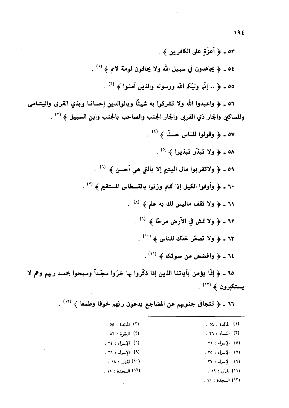 56 - {وَاعْبُدُوا اللَّهَ وَلَا تُشْرِكُوا بِهِ شَيْئًا وَبِالْوَالِدَيْنِ إِحْسَانًا وَبِذِي الْقُرْبَى وَالْيَتَامَى وَالْمَسَاكِينِ وَالْجَارِ ذِي الْقُرْبَى وَالْجَارِ الْجُنُبِ وَالصَّاحِبِ بِالْجَنْبِ وَابْنِ السَّبِيلِ} (3).