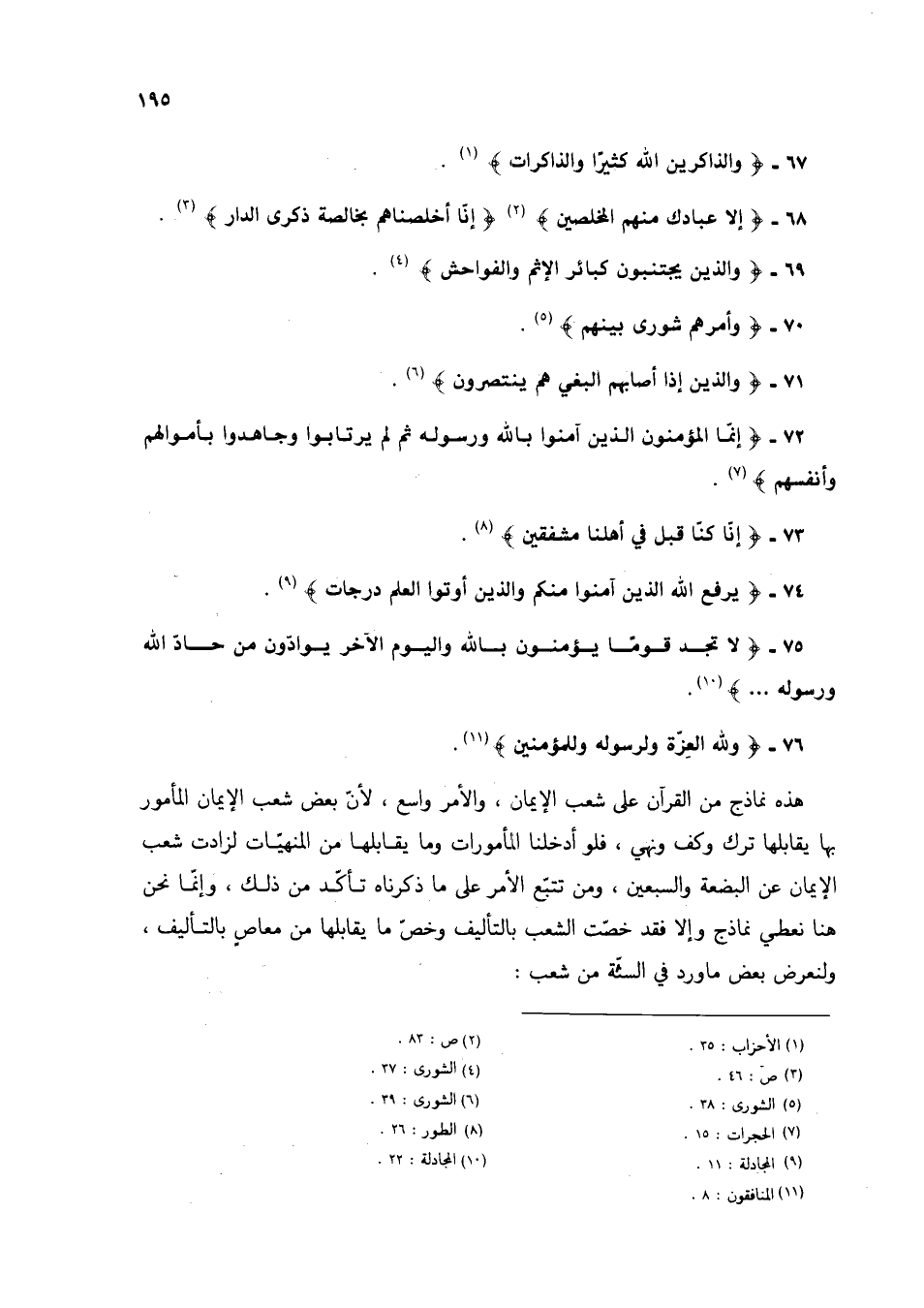 هذه نماذج من القرآن على شعب الإيمان، والأمر واسع، لأن بعض شعب الإيمان المأمور بها يقابلها ترك وكف ونهي، فلو أدخلنا المأمورات وما يقابلها من المنهيات لزادت شعب الإيمان عن البضعة والسبعين، ومن تتبع الأمر على ما ذكرناه تأكد من ذلك، وإنما نحن هنا نعطي نماذج وإلا فقد خصت الشعب بالتأليف وخص ما يقابلها من معاص بالتأليف، ولنعر بعض ما ورد في السنة من شعب: