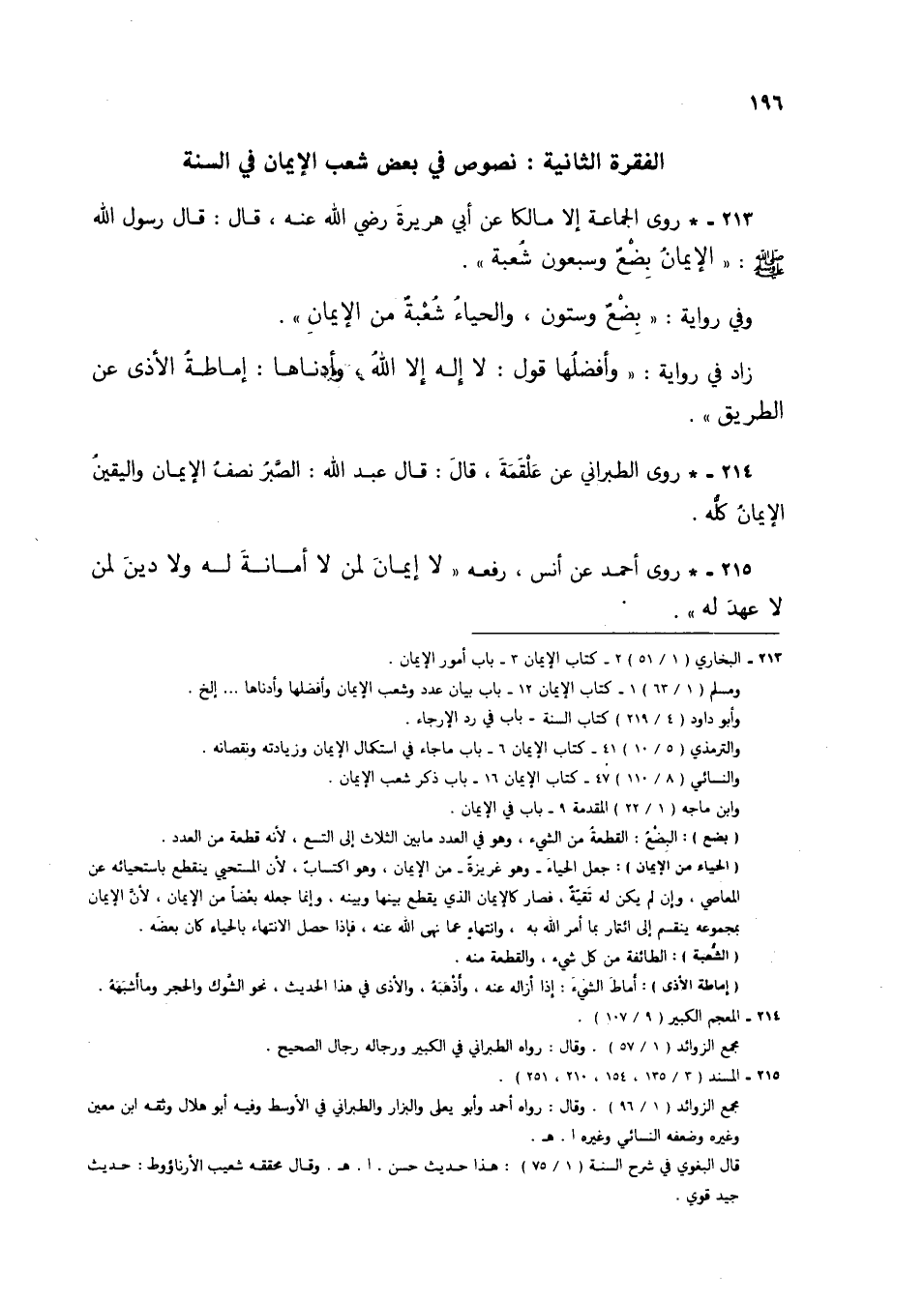 213 - * روى الجماعة إلا مالكا عن أبي هريرة رضي الله عنه، قال: قال رسول الله صلى الله عليه وسلم: "الإيمان بضع وسبعون شعبة".