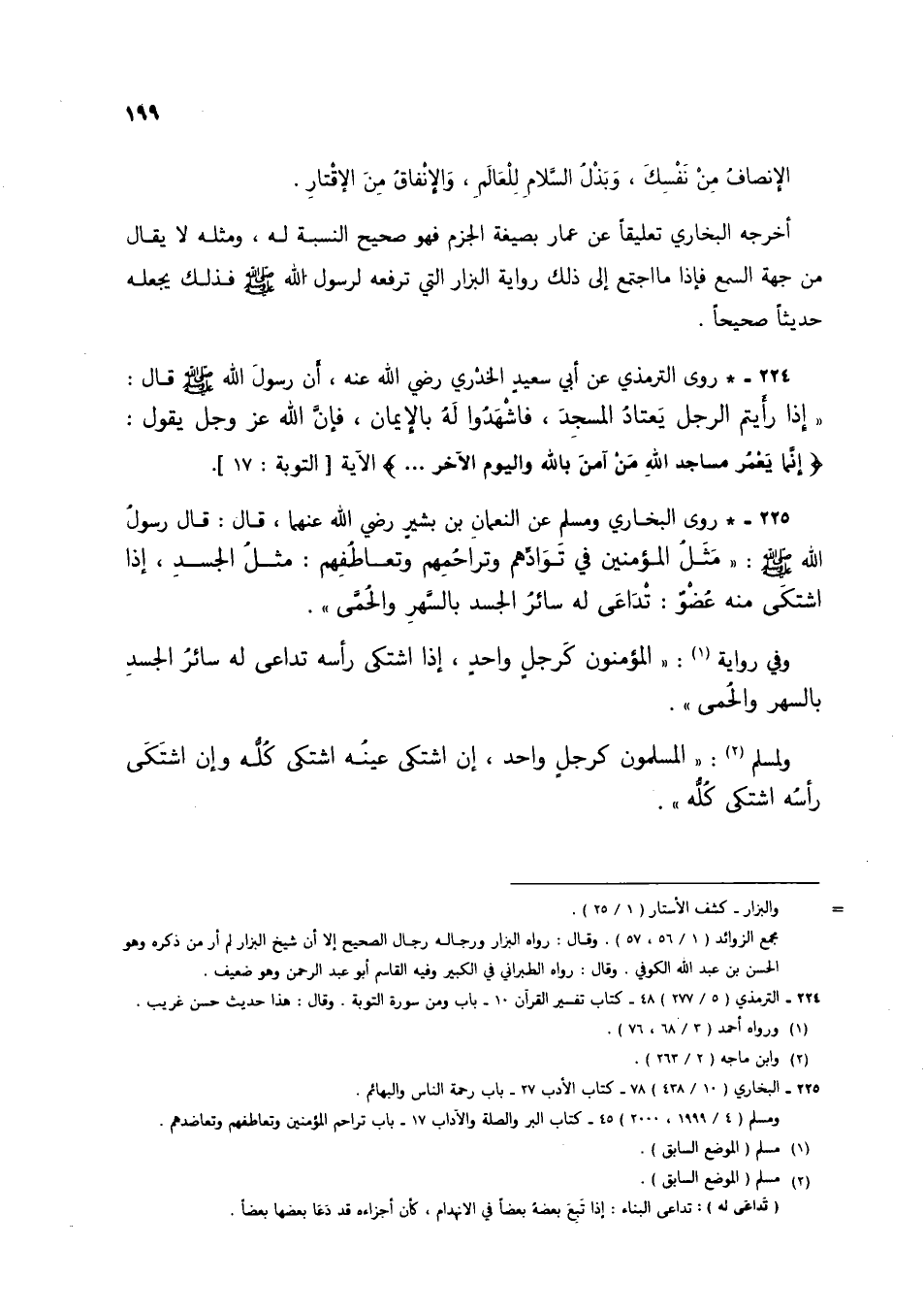 225 - * روى البخاري ومسلم عن النعمان بن بشير رضي الله عنهما، قال: قال رسول الله صلى الله عليه وسلم: "مثل المؤمنين في توادهم وتراحمهم وتعاطفهم: مثل الجسد، إذا اشتكى منه عضو: تداعى له سائل الجسد بالسهر والحمى"