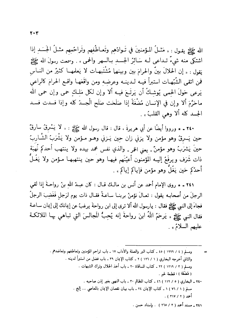 الله صلى الله عليه وسلم يقول: "مثلُ المؤمنين في توادهم وتعاطفهم وتراحمهم مثل الجسد إذا اشتكى منه شيءٌ تداعى له سائرُ الجسد بالسهر والحمى". وسمعت رسول الله صلى الله عليه وسلم يقول: "إن الحلال بينٌ والحرام بين وبينهما مشتبهات لا يعلمها كثير من الناس فمن اتقى الشبهات استبرأ فيه لدينه وعرضه ومن واقعها واقع الحرام كالراعي يرعى حول الحمى يُوشكُ أن يرتع فيه ألا وإن لكل ملكٍ حمى وإن حمى الله ما حرَّم ألا وإن في الإنسان مُضغةً إذا صلحت صلح الجسد كله وإذا فسدت فسد الجسد كله ألا وهي القلب".