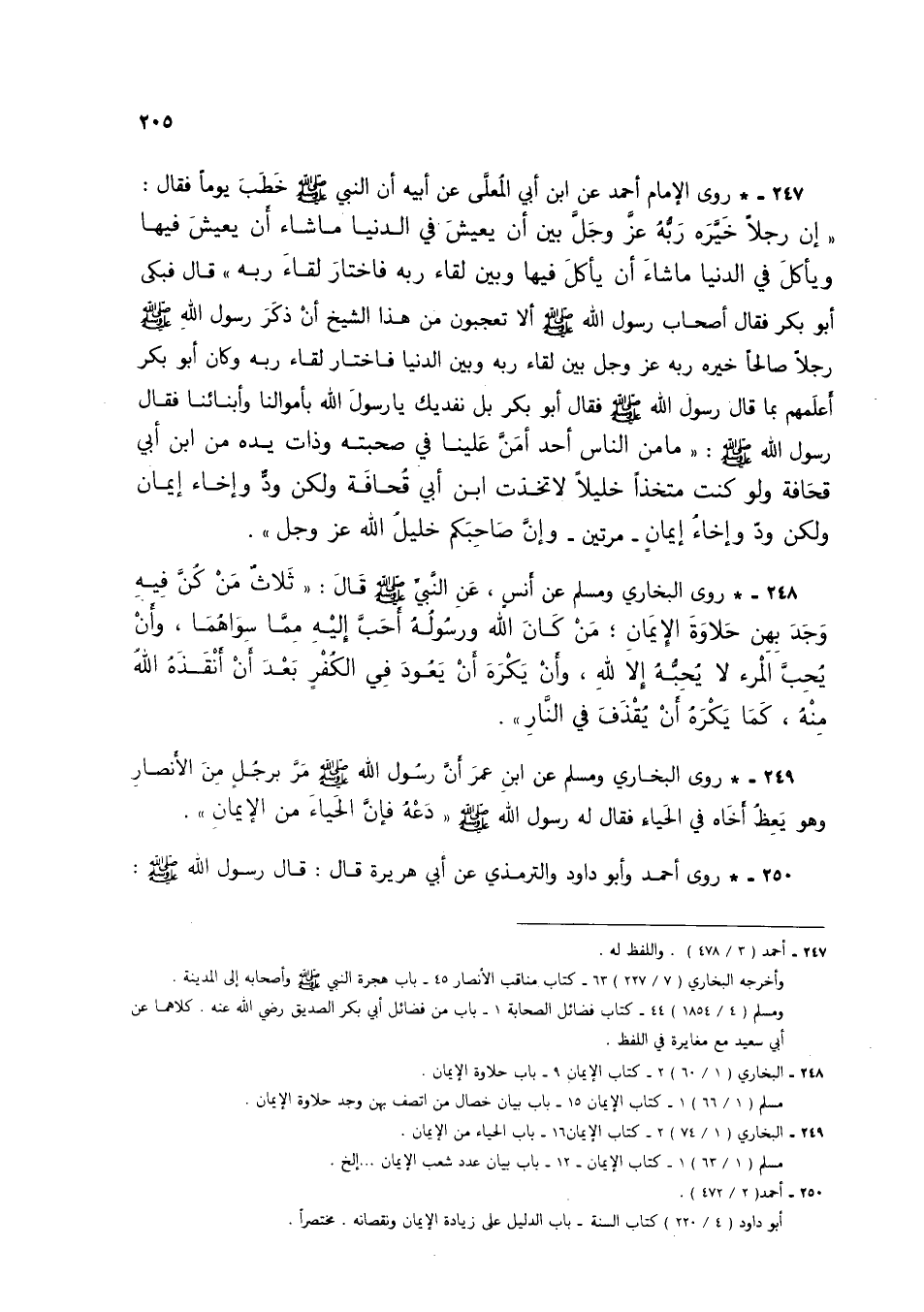 248 - * روى البخاري ومسلم عن أنسٍ، عن النبي صلى الله عليه وسلم قال: "ثلاث من كن فيه وجد بهن حلاوة الإيمان؛ من كان الله ورسوله أحب إليه مما سواهما، وأن يحب المرء لا يحبه إلا الله، وأن يكره أن يعود في الكفرٍ بعد أن أنقذه الله منه، كما يكره أن يقذف في النار".