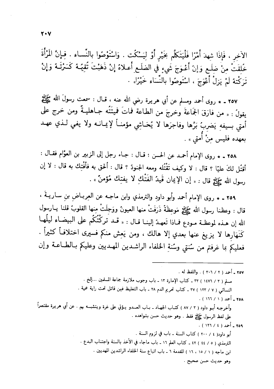 259 - * روى الإمام أحمد وأبو داود والترمذي وابن ماجه عن العرباض بن سارية، قال: وعظنا رسول الله صلى الله عليه وسلم موعظة ذرفت منها العيون ووجلت منها القلوب قلنا يا رسول الله إن هذه لموعظة مودع فماذا تعهد إلينا قال: "قال تركتكم على البيضاء ليلها كنهارها لا يزيغ عنها يعدي إلا هالك، ومن يعش منكم فسيرى اختلافاً كثيراً. فعليكم بما عرفتم من سنتي وسنة الخلفاء الراشدين المهديين وعليكم بالطاعة وإن