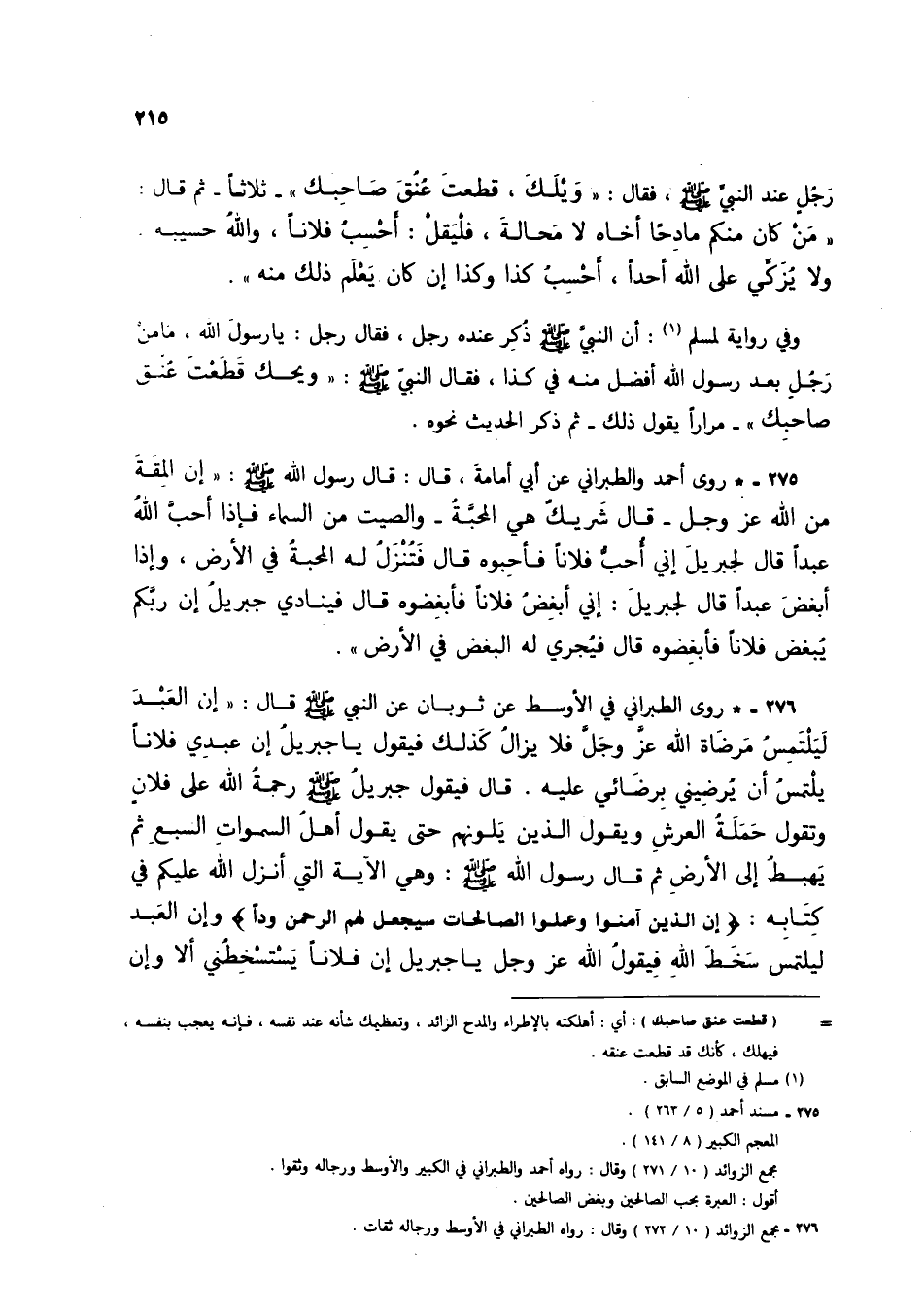276 - * روى الطبراني في الأوسط عن ثوبان عن النبي صلى الله عليه وسلم قال: "إن العبد ليلتمس مرضاة الله عز وجل فلا يزال كذلك فيقول يا جبريل إن عبدي فلاناً يلتمس أن يرضيني برضائي عليه. قال فيقول جبريل صلى الله عليه وسلم رحمة الله على فلان وتقول حملة العرش ويقول الذين يلونهم حتى يقول أهل السموات السبع ثم يهبط إلى الأرض ثم قال رسول الله صلى الله عليه وسلم: وهي الآية التي أنزل الله عليكم في كتابه: {إِنَّ الَّذِينَ آمَنُوا وَعَمِلُوا الصَّالِحَاتِ سَيَجْعَلُ لَهُمُ الرَّحْمَنُ وُدًّا} وإن العبد ليلتمس سخط الله فيقول الله عز وجل يا جبريل إن فلاناً يستسخطني ألا وإن