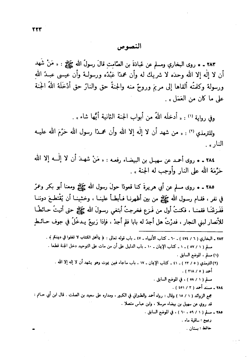 284 - * روى أحمد عن سهيل بن البيضاء رفعه: "من شهد أن لا إله إلا الله حرمه الله على النار وأوجب له الجنة".