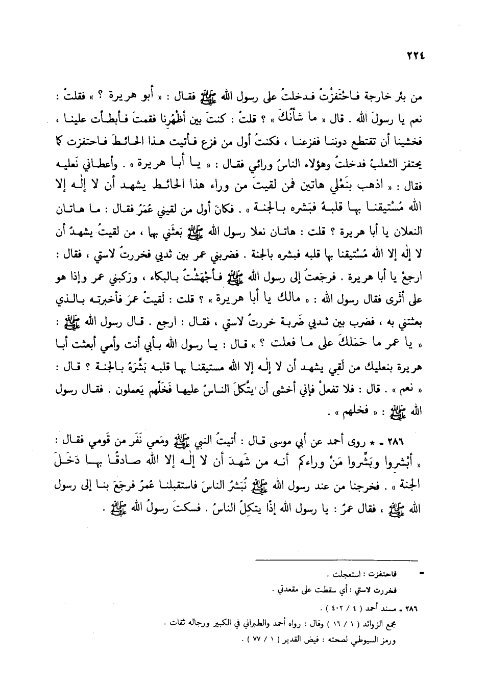 من بئر خارجة فاحتفزت فدخلت على رسول الله صلى الله عليه وسلم فقال: "أبو هريرة؟ " فقلت: نعم يا رسول الله. قال "ما شأنك"؟ قلت: كنت بين أظهرنا فقمت فأبطأت علينا، فخشينا أن تقتطع دوننا ففزعنا، فكنت أول من فزع فأتيت هذا الحائط فاحتفزت كما يحتفز الثعلب فدخلت وهؤلاء الناس ورائي فقال: "يا أبا هريرة". وأعطاني نعليه فقال: "اذهب بنعلي هاتين فمن لقيت من وراء هذا الحائط يشهد أن لا إله إلا الله مستيقنا بها قلبه فبشره بالجنة". فكان أول من لقيني عمر فقال: ما هاتان النعلان يا أبا هريرة؟ قلت: هاتان نعلا رسول الله صلى الله عليه وسلم بعثني بهما: من لقيت يشهد أن لا إله إلا الله مستيقنا بها قلبه بالجنة. فضربني عمر بين ثديي فخررت لاستي، فقال: ارجع يا أبا هريرة. فرجعت إلى رسول الله صلى الله عليه وسلم فأجهشت بالبكاء، وركبني عمر وإذا هو على أثرى فقال رسول الله: "مالك يا أبا هريرة"؟ قلت: لقيت عمر فأخبرته بالذي بعثني به، فضرب بين ثديي ضربة خررت لاستي، فقال: ارجع. قال رسول الله صلى الله عليه وسلم: "يا عمر ما حملك على ما فعلت؟ " قال: يا رسول الله بأبي أنت وأمي أبعثت أبا هريرة بنعليك من لقي يشهد أن لا إله إلا الله مستيقنا بها قلبه بشره بالجنة؟ قال: "نعم". قال: فلا تفعل فإني أخشى أن يتكل الناس عليها فخلهم يعملون. فقال رسول الله صلى الله عليه وسلم: "فخلهم".