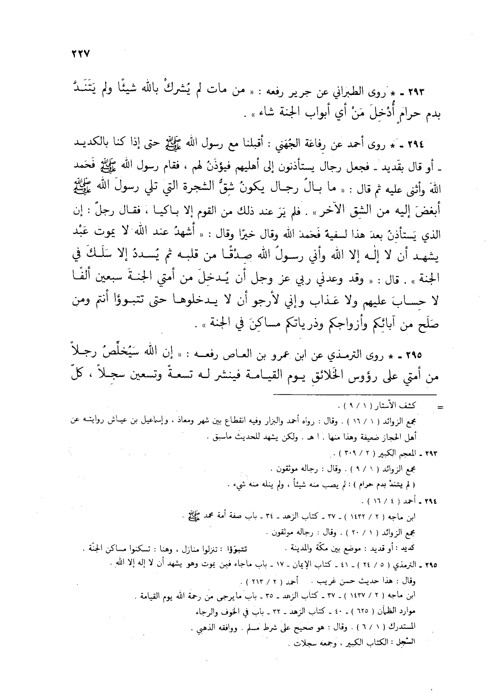 293 - * روى الطبراني عن جرير رفعه: "من مات لم يشرك بالله شيئًا ولم يتند بدم حرامٍ أدخل من أي أبواب الجنة شاء".