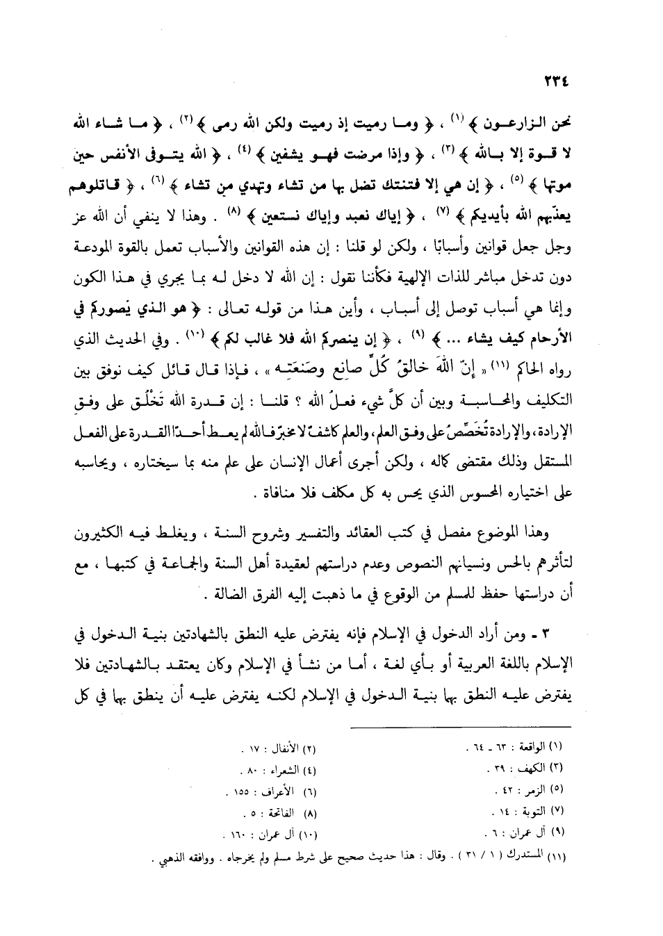 أَمْ نَحْنُ الزَّارِعُونَ} (1)، {وَمَا رَمَيْتَ إِذْ رَمَيْتَ وَلَكِنَّ اللَّهَ رَمَى} (2)، {مَا شَاءَ اللَّهُ لَا قُوَّةَ إِلَّا بِاللَّهِ} (3)، {وَإِذَا مَرِضْتُ فَهُوَ يَشْفِينِ} (4)، {اللَّهُ يَتَوَفَّى الْأَنْفُسَ حِينَ مَوْتِهَا} (5)، {إِنْ هِيَ إِلَّا فِتْنَتُكَ تُضِلُّ بِهَا مَنْ تَشَاءُ وَتَهْدِي مَنْ تَشَاءُ} (6)، {قَاتِلُوهُمْ يُعَذِّبْهُمُ اللَّهُ بِأَيْدِيكُمْ} (7)، {إِيَّاكَ نَعْبُدُ وَإِيَّاكَ نَسْتَعِينُ} (8). وهذا لا ينفي أن الله عز وجل جعل قوانين وأسبابًا، ولكن لو قلنا: إن هذه القوانين والأسباب تعمل بالقوة المودعة دون تدخل مباشر للذات الإلهية فكأننا نقول: إن الله لا دخل له بما يجري في هذا الكون وإنما هي أسباب توصل إلى أسباب، وأين هذا من قوله تعالى: {هُوَ الَّذِي يُصَوِّرُكُمْ فِي الْأَرْحَامِ كَيْفَ يَشَاءُ ...} (9)، {إِنْ يَنْصُرْكُمُ اللَّهُ فَلَا غَالِبَ لَكُمْ} (10). وفي الحديث الذي رواه الحاكم (11) "إن الله خالق كل صانع وصنعته"، فإذا قال قائل كيف نوفق بين التكليف والمحاسبة وبين أن كل شيء فعل الله؟ قلنا: إن قدرة الله تخلق على وفق الإرادة، والإرادة تخصص على وفق العلم، والعلم كاشف لا مخبر فالله لم يعط أحدًا القدرة على الفعل المستقل وذلك مقتضى كماله، ولكن أجرى أعمال الإنسان على علم منه بما سيختاره، ويحاسبه على اختياره المحسوس الذي يحس به كل مكلف فلا منافاة.