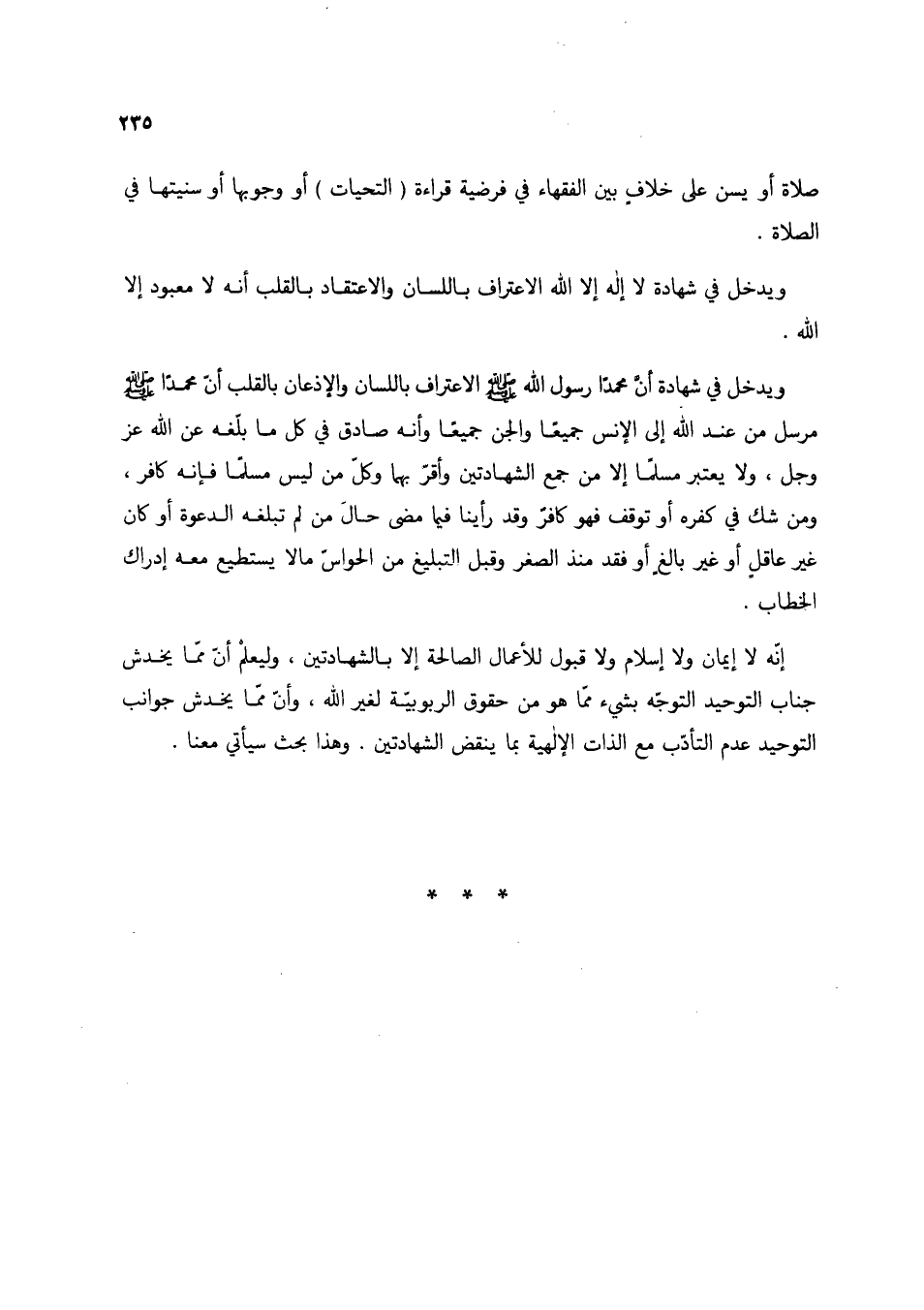 إنه لا إيمان ولا إسلام ولا قبول للأعمال الصالحة إلا بالشهادتين، وليعلم أن مما يخدش جناب التوحيد التوجه بشيء مما هو من حقوق الربوبية لغير الله، وأن مما يخدش جوانب التوحيد عدم التأدب مع الذات الإلهية بما ينقض الشهادتين. وهذا بحث سيأتي معنا.