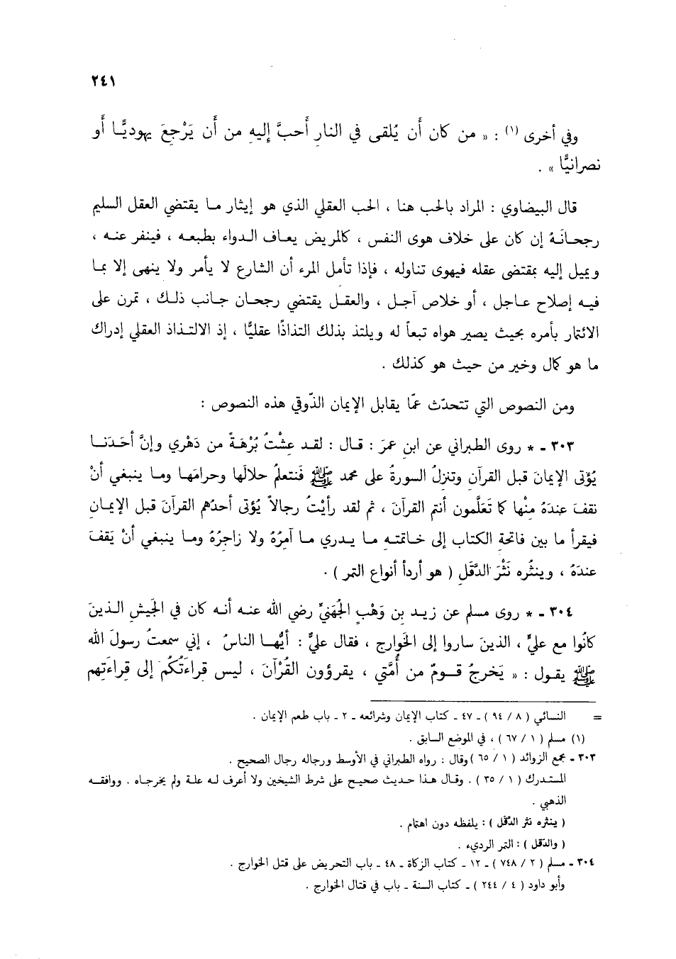 304 - * روى مسلم عن زيد بن وهبٍ الجهني رضي الله عنه أنه كان في الجيش الذين كانوا مع علي، الذين ساروا إلى الخوارج، فقال علي: أيها الناس، إني سمعت رسول الله صلى الله عليه وسلم يقول: "يخرج قوم من أمتي، يقرؤون القرآن، ليس قراءتكم إلى قراءتهم