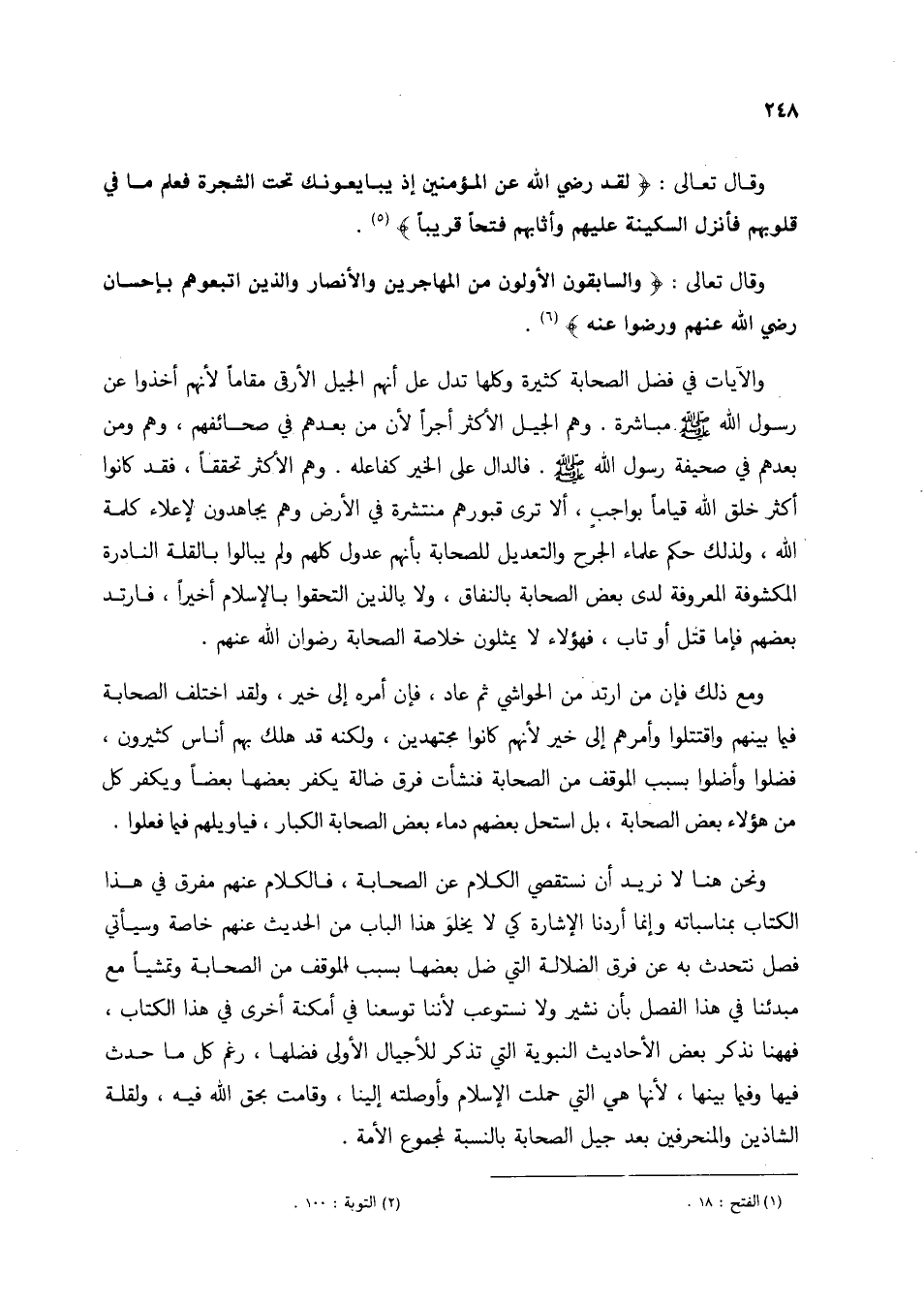 ونحن هنا لا نريد أن نستقصي الكلام عن الصحابة، فالكلام عنهم مفرق في هذا الكتاب بمناسباته وإنما أردنا الإشارة كي لا يخلو هذا الباب من الحديث عنهم خاصة وسيأتي فصل نتحدث به عن فرق الضلالة التي ضل بعضها بسبب الموقف من الصحابة وتمشياً مع مبدئنا في هذا الفصل بأن نشير ولا نستوعب لأننا توسعنا في أمكنة أخرى في هذا الكتاب، فههنا نذكر بعض الأحاديث النبوية التي تذكر للأجيال الأولى فضلها، رغم كل ما حدث فيها وفيما بينها، لأنها هي التي حملت الإسلام وأوصلته إلينا، وقامت بحق الله فيه، ولقلة الشاذين والمنحرفين بعد جيل الصحابة بالنسبة لمجموع الأمة.