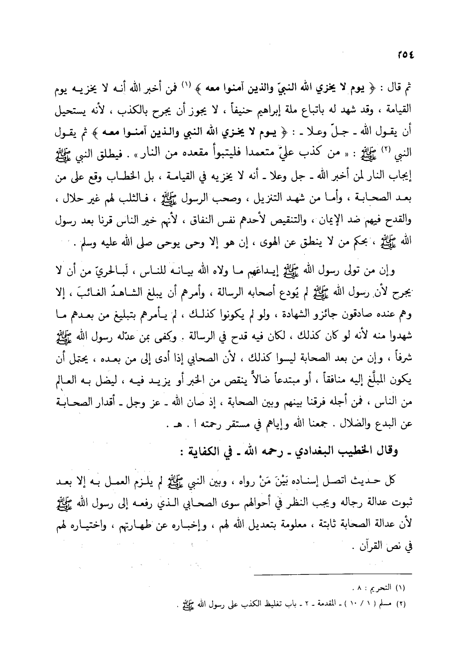 ثم قال: {يَوْمَ لَا يُخْزِي اللَّهُ النَّبِيَّ وَالَّذِينَ آمَنُوا مَعَهُ} (1) فمن أخبر الله أنه لا يخزيه يوم القيامة، وقد شهد له بإتباع ملة إبراهيم حنيفاً، لا يجوز أن يجرح بالكذب، لأنه يستحيل أن يقول الله -جل وعلا-: {يَوْمَ لَا يُخْزِي اللَّهُ النَّبِيَّ وَالَّذِينَ آمَنُوا مَعَهُ} ثم يقول النبي (2) صلى الله عليه وسلم: "من كذب علي متعمدا فليتبوأ مقعده من النار". فيطلق النبي صلى الله عليه وسلم إيجاب النار لمن أخبر الله -جل وعلا- أنه لا يخزيه في القيامة، بل الخطاب وقع على من بعد الصحابة، وأما من شهد التنزيل، وصحب الرسول صلى الله عليه وسلم، فالثلب لهم غير حلال، والقدح فيهم ضد الإيمان، والتنقيص لأحدهم نفس النفاق، لأنهم خير الناس قرنا بعد رسول الله صلى الله عليه وسلم، بحكم من لا ينطق عن الهوى، إن هو إلا وحى يوحى صلى الله عليه وسلم.